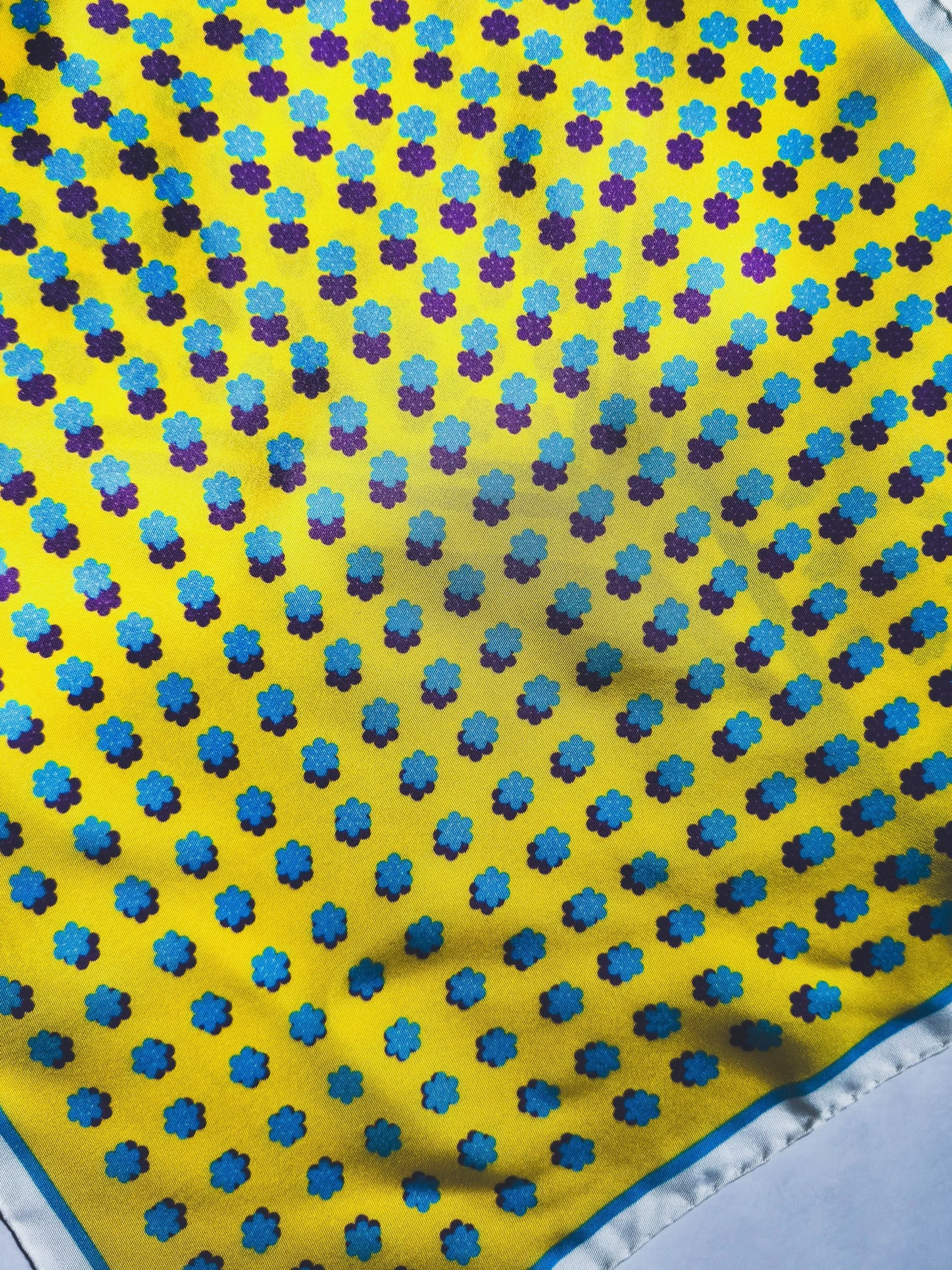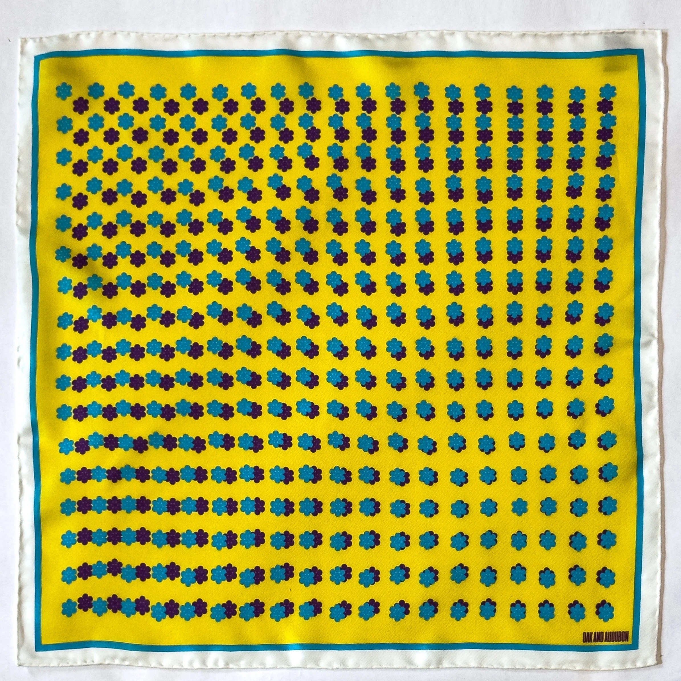 In featherweight 15 oz pure silk this handmade pocket square is a perfect addition to your wardrobe. In sunrise yellow, with turquoise blue and royal purple Cluster Dots.
