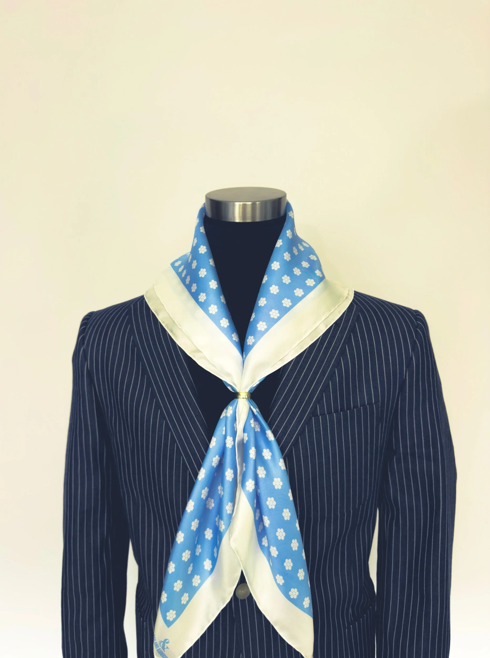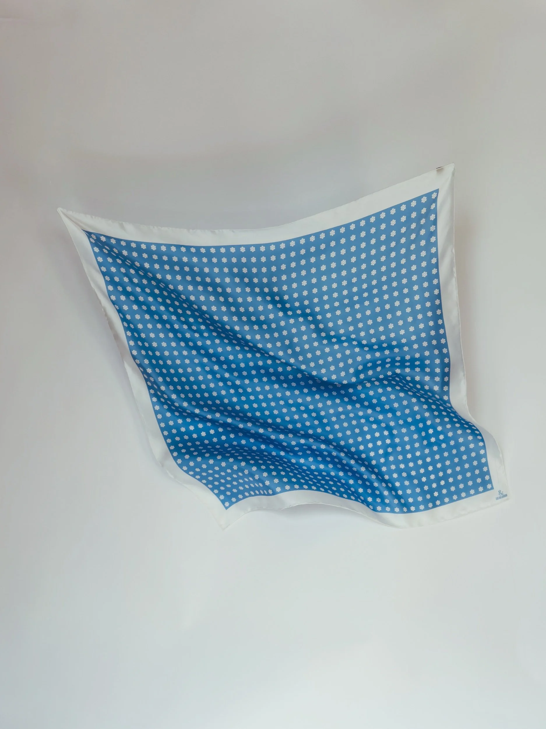 In featherweight 15 oz pure silk this handmade scarf is a unisex piece that can be enjoyed by anyone. In baby blue base with white Cluster Dot and border.