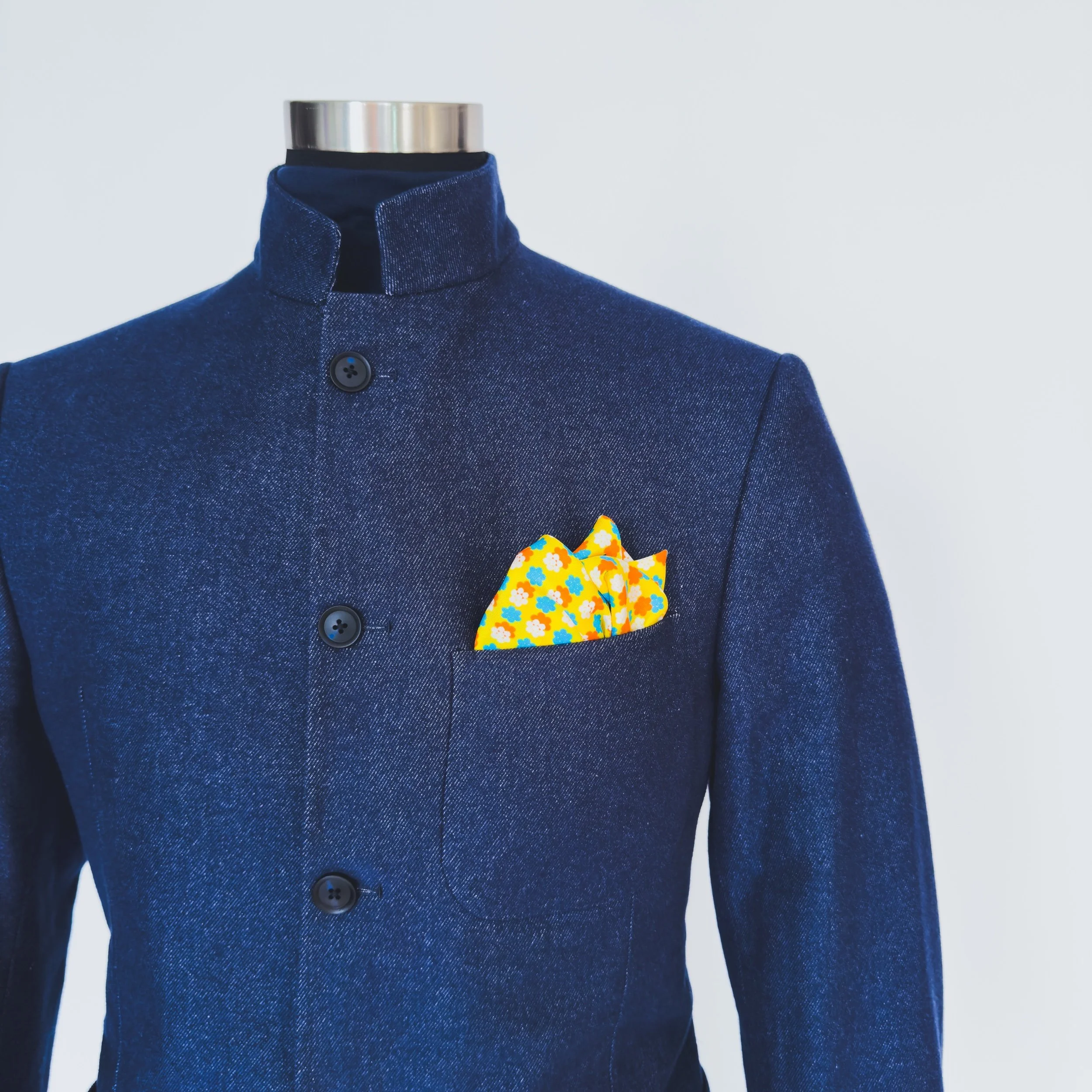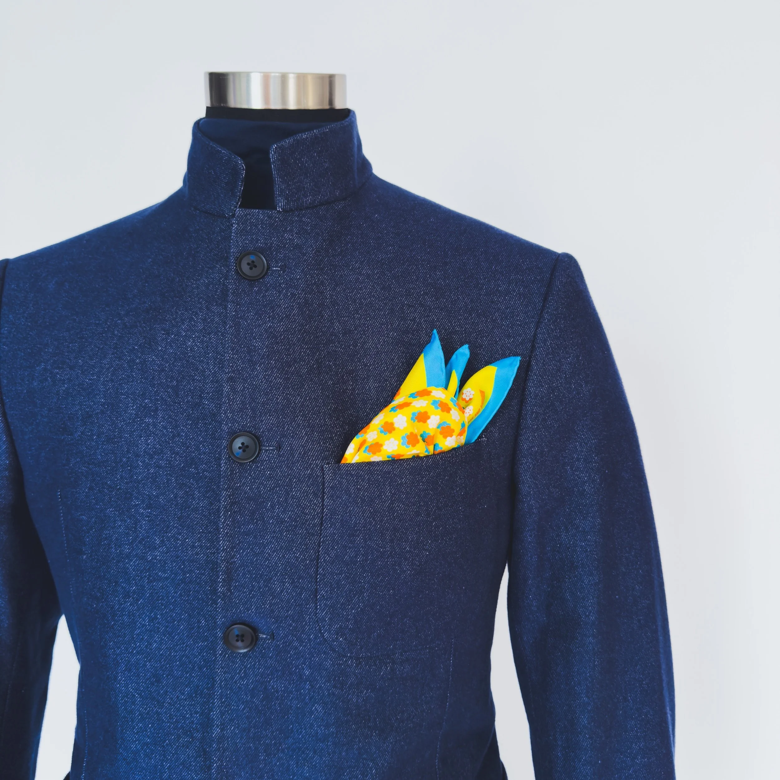 In featherweight 15 oz pure silk this handmade pocket square is a perfect addition to your wardrobe. In sunrise yellow, with turquoise blue and orange Cluster Dots.