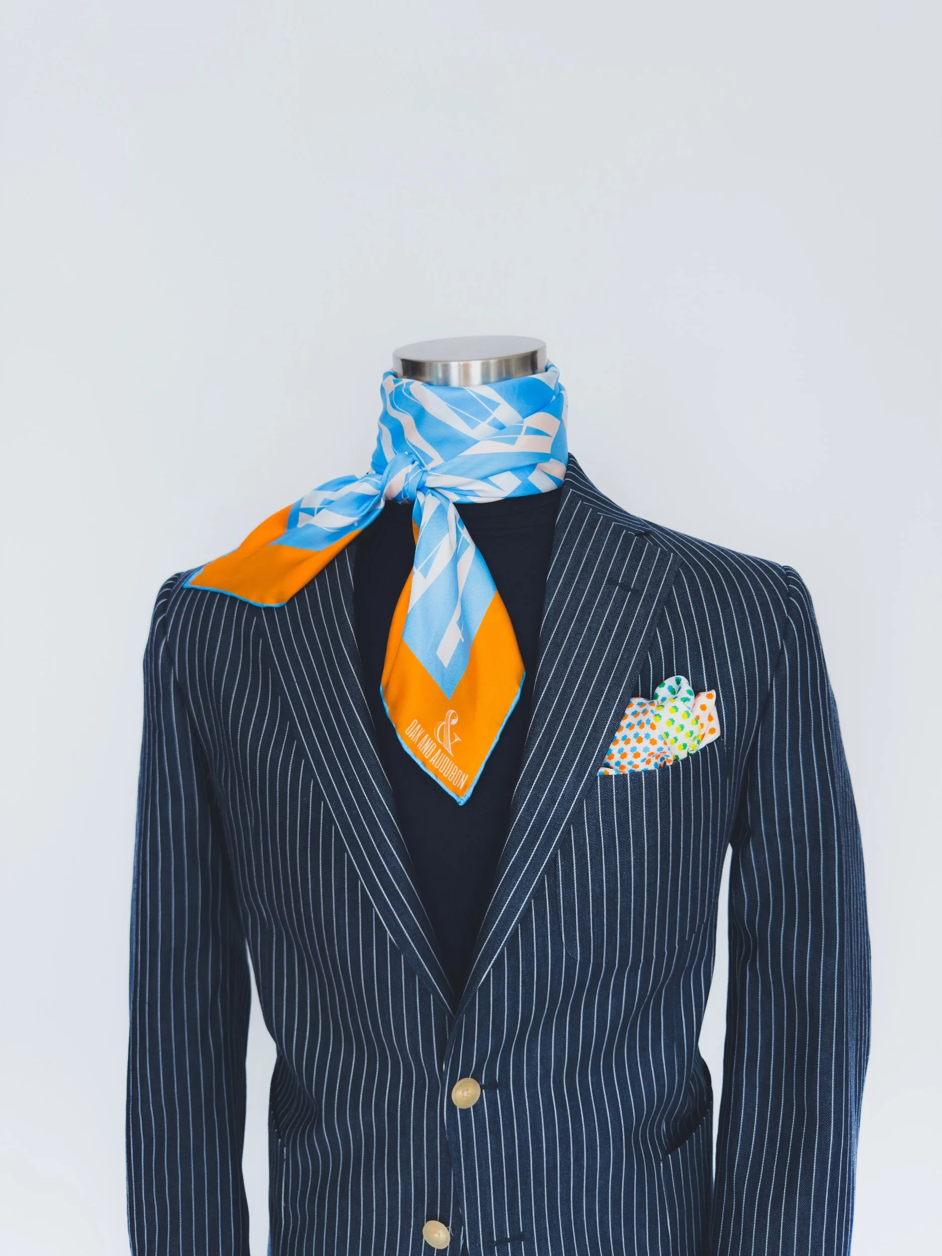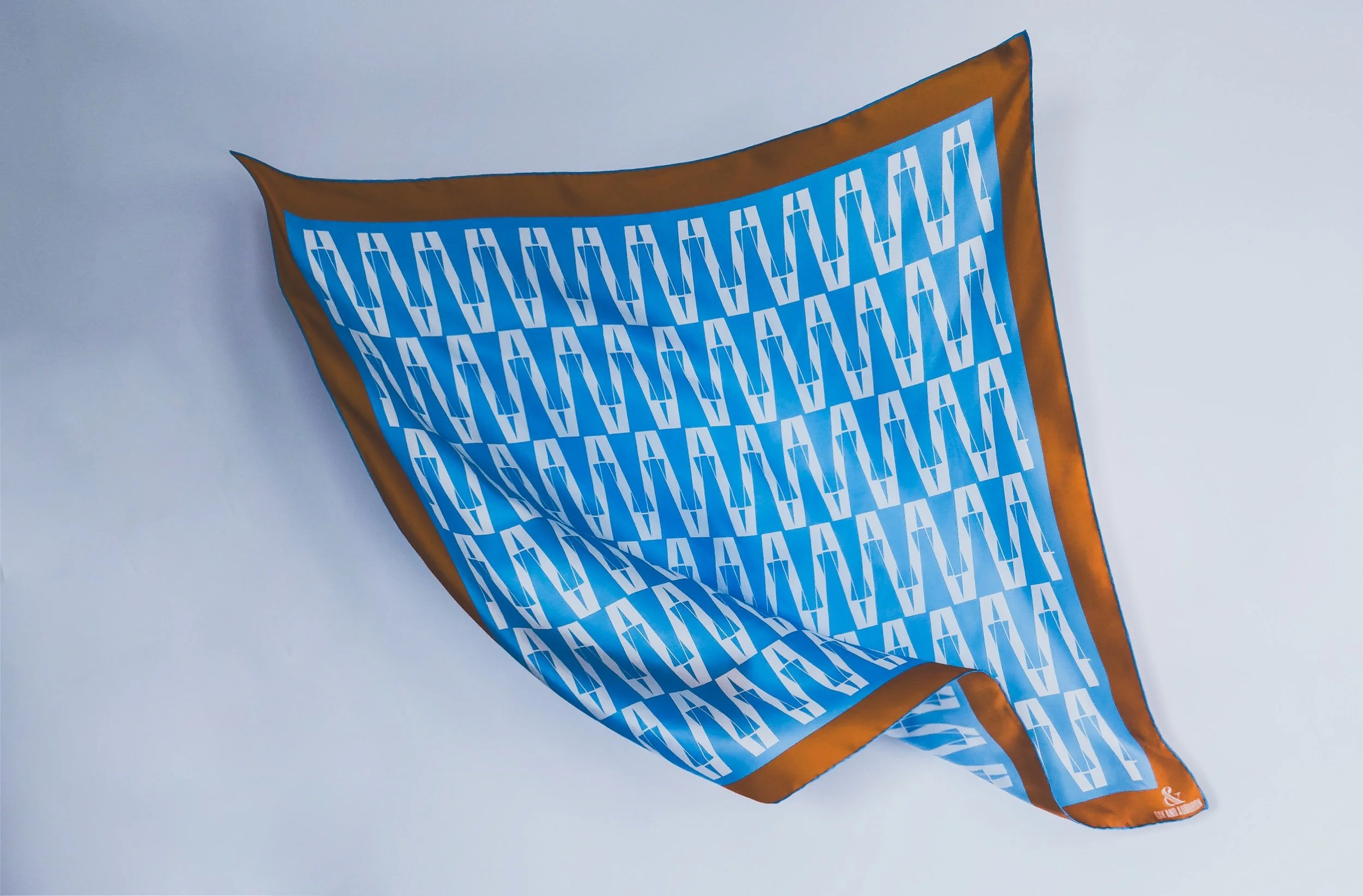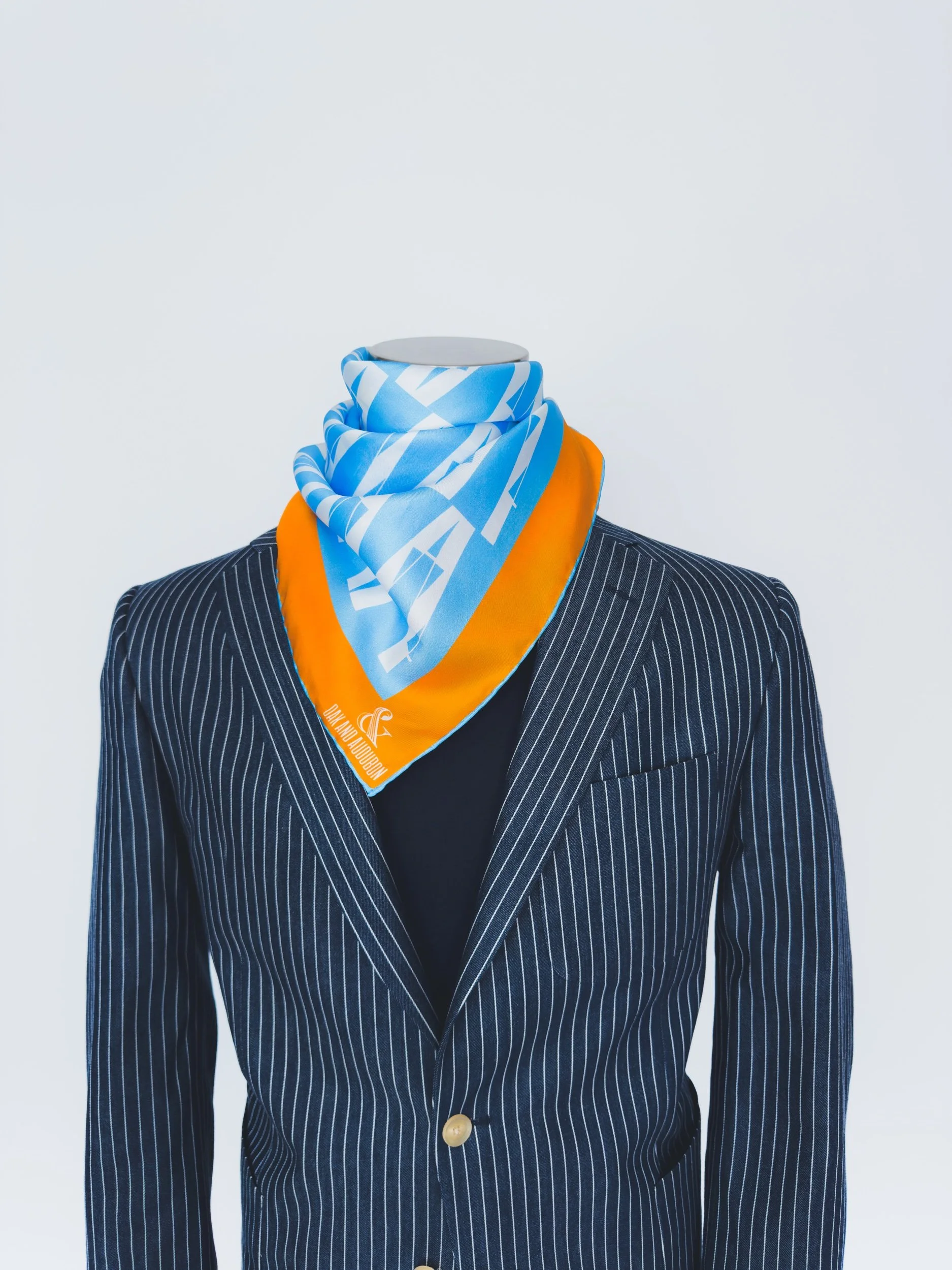 In featherweight 15 oz pure silk this handmade scarf is a unisex piece that can be enjoyed by anyone. In light blue and white with orange border.
