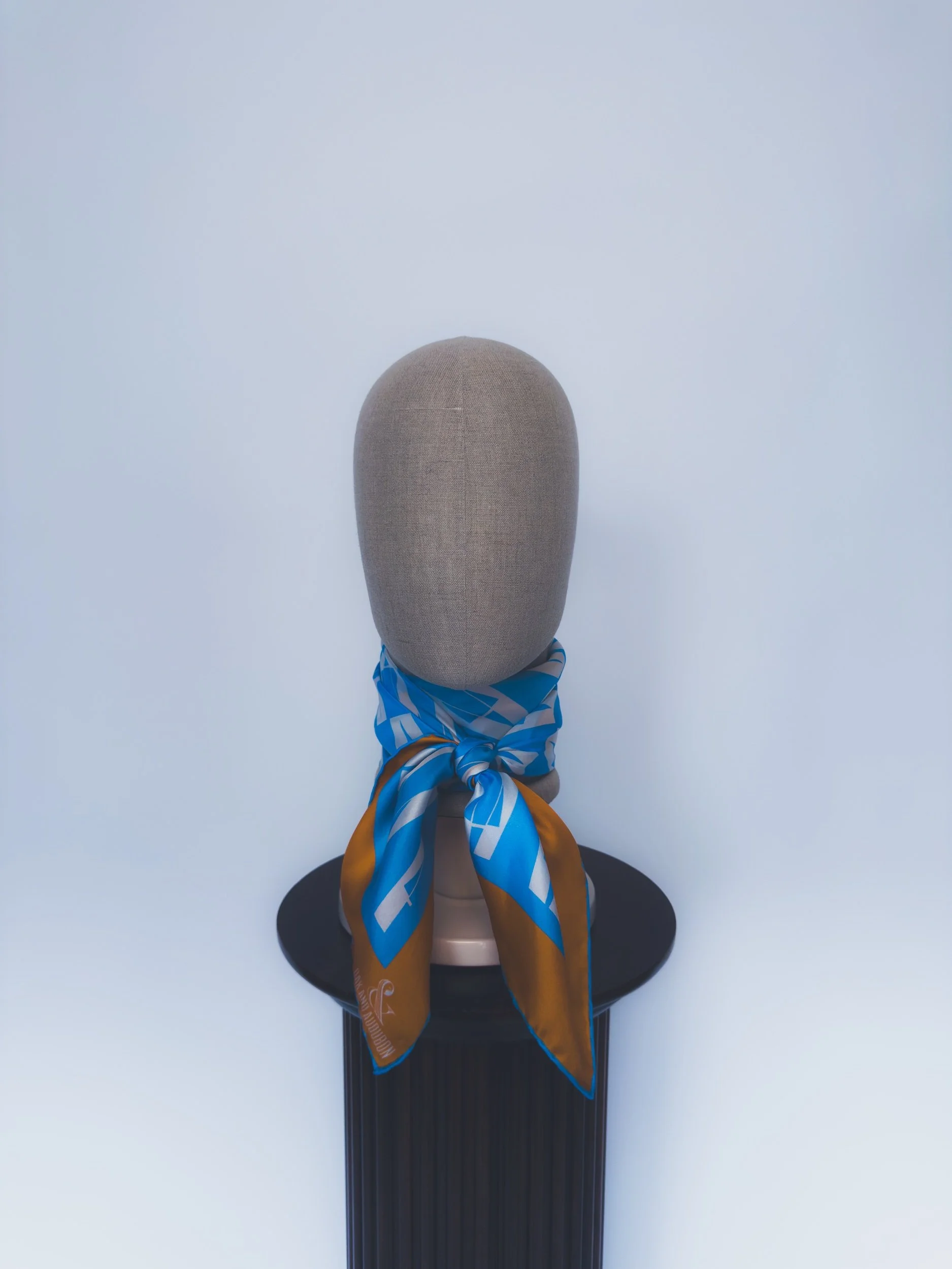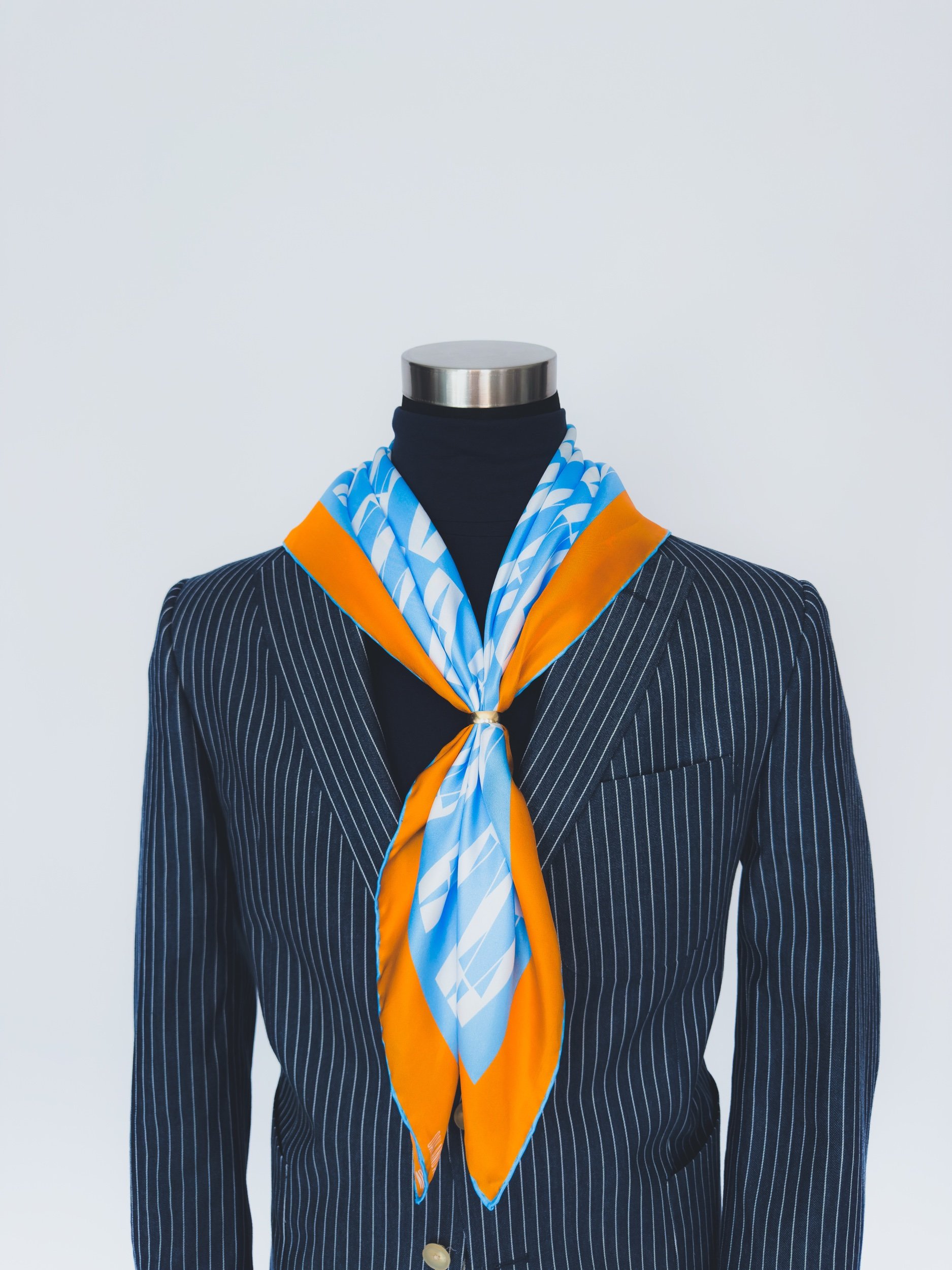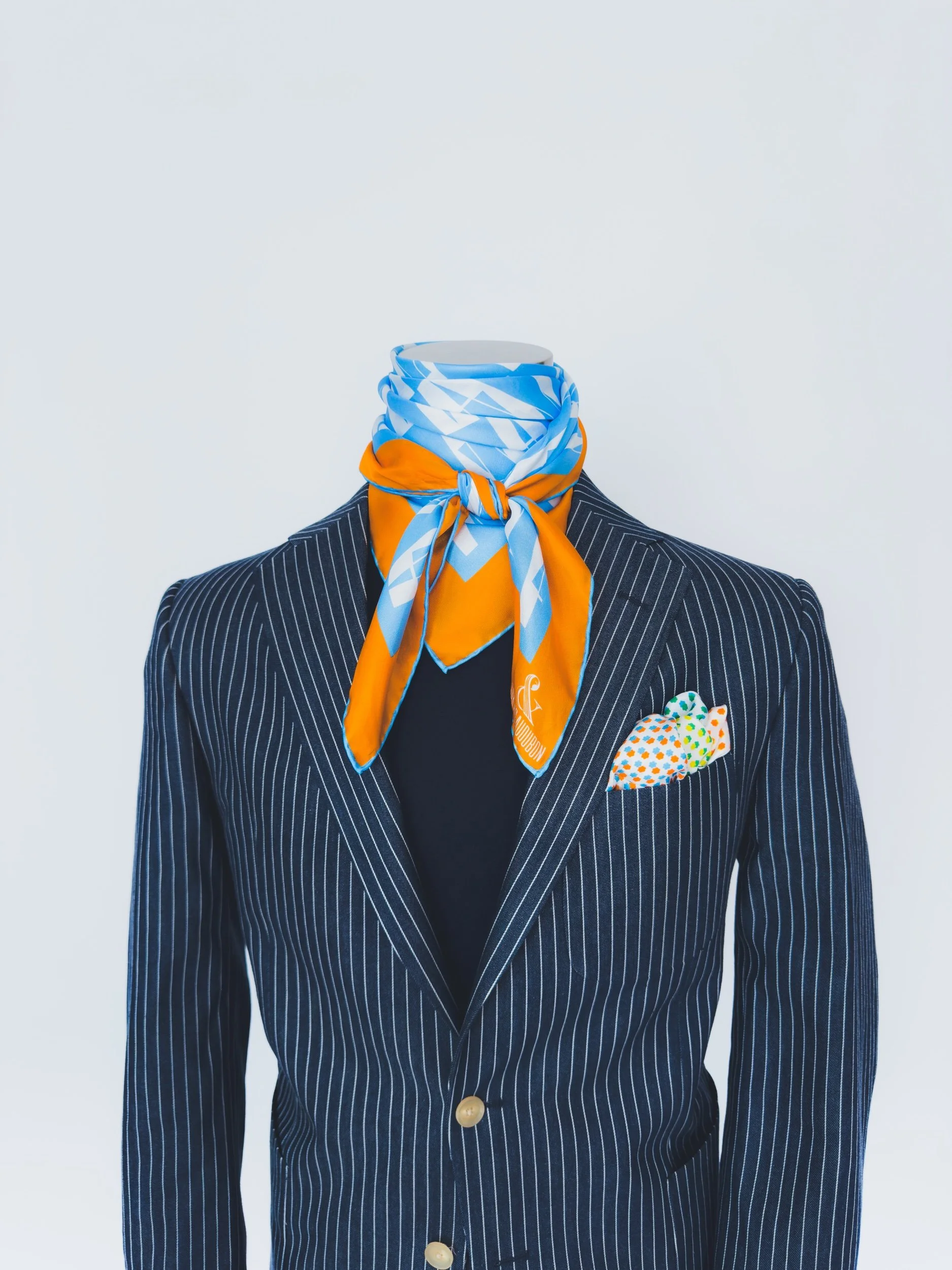 In featherweight 15 oz pure silk this handmade scarf is a unisex piece that can be enjoyed by anyone. In light blue and white with orange border.
