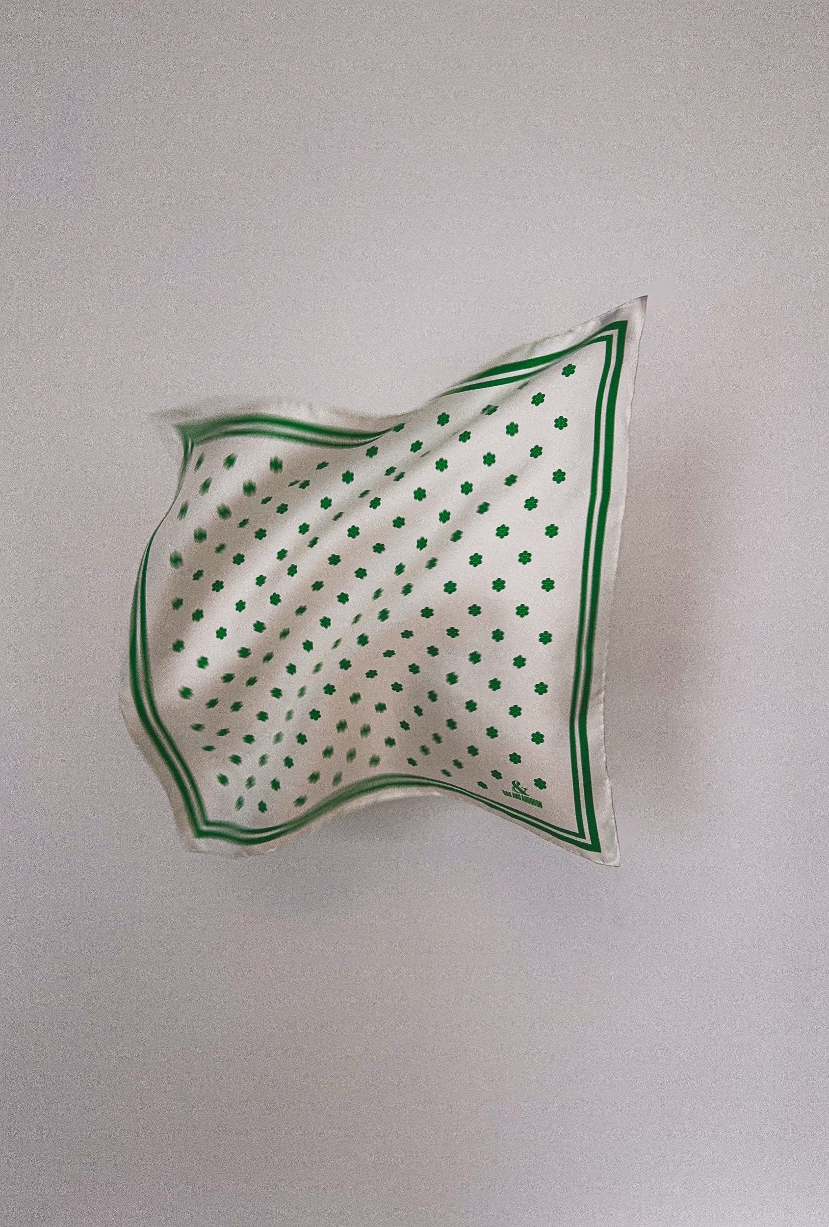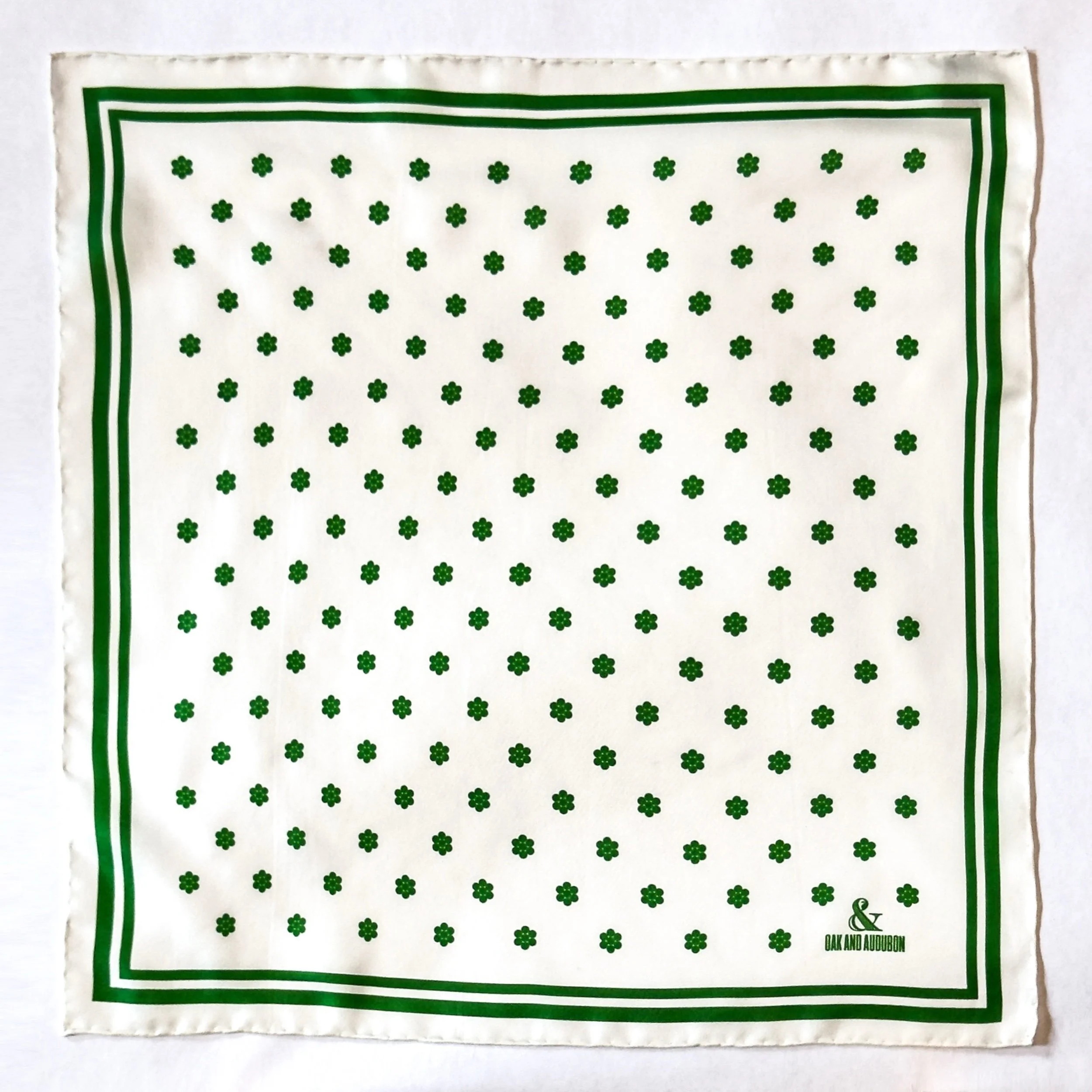 In featherweight 15 oz pure silk this handmade pocket square is a perfect addition to your wardrobe. In white with kelly green Cluster Dots.