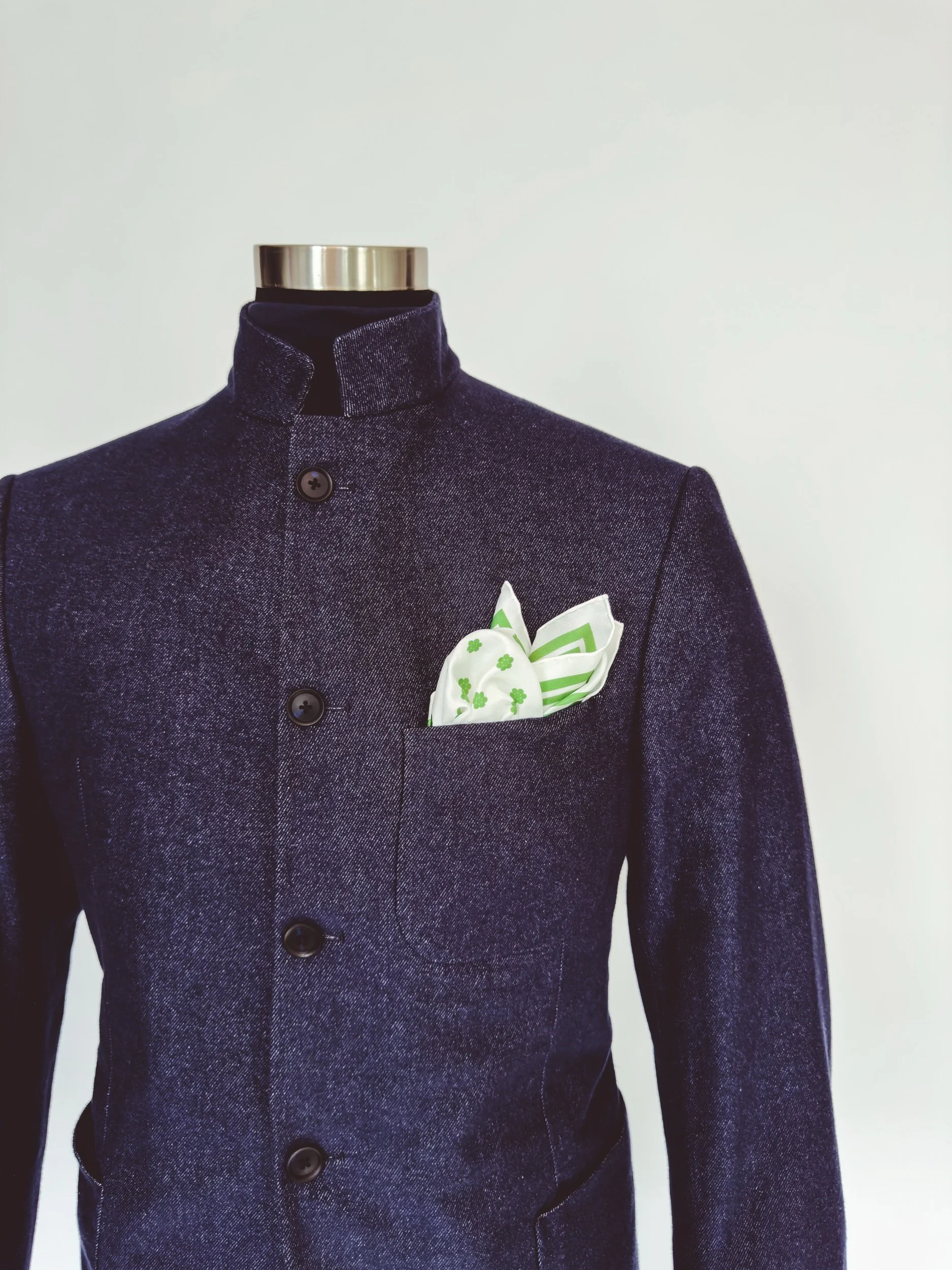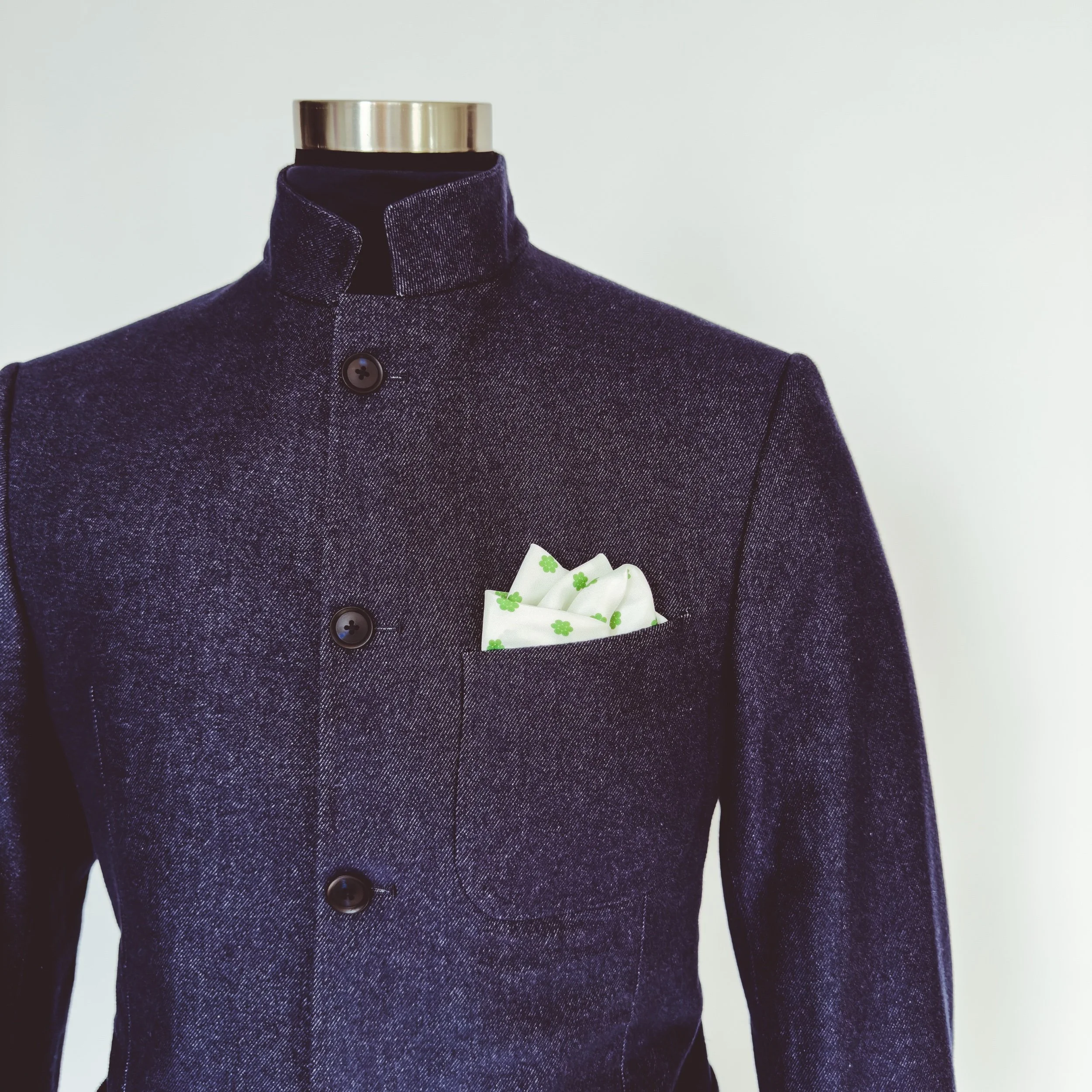 One day while designing, I was in need of a shape to create some positive space in a pattern and I found the answer on my finger- my heirloom seven diamond cluster signet ring. For me it just clicked, and soon the seven-dot cluster found its way into almost every design and naturally as this classic polka dot pattern pocket square.