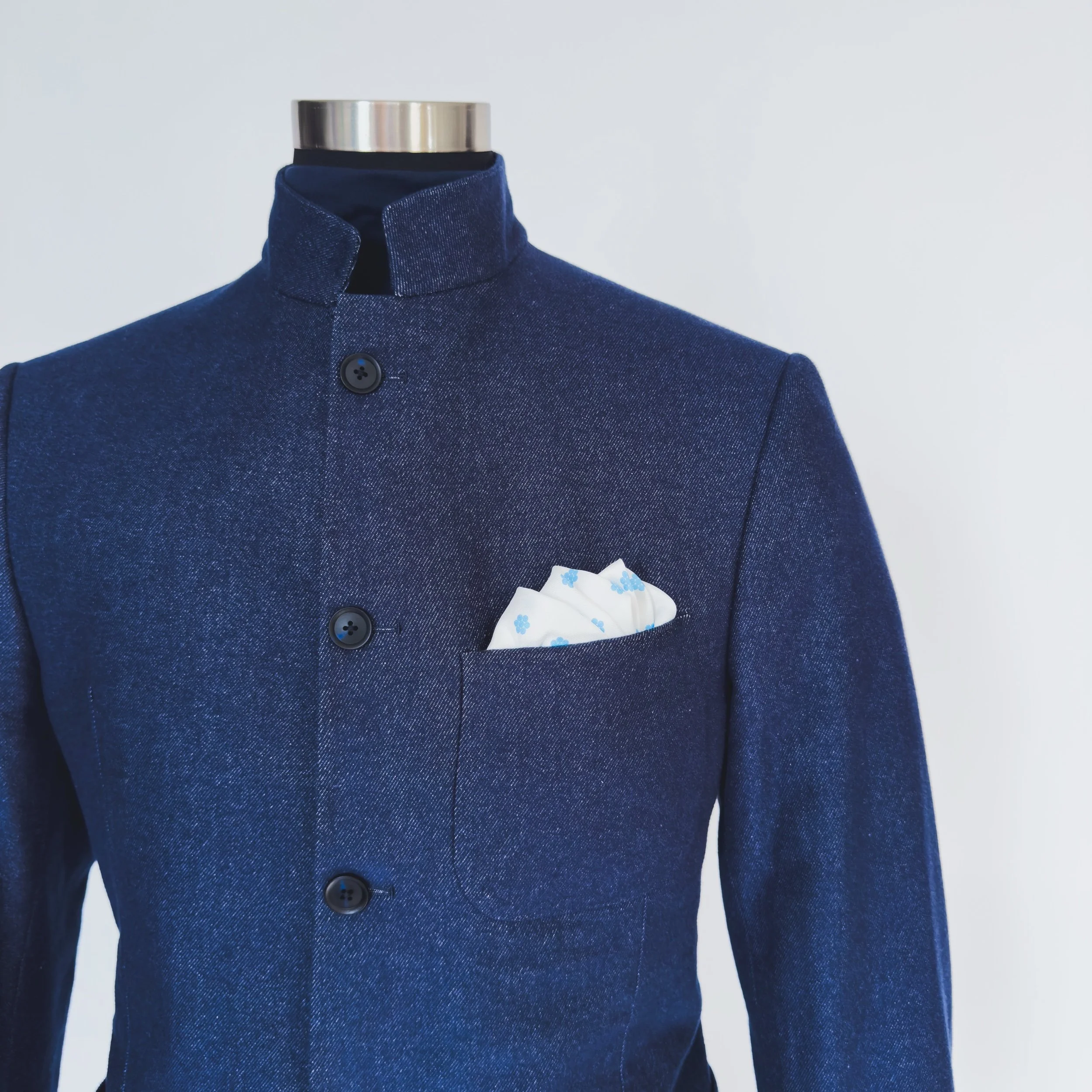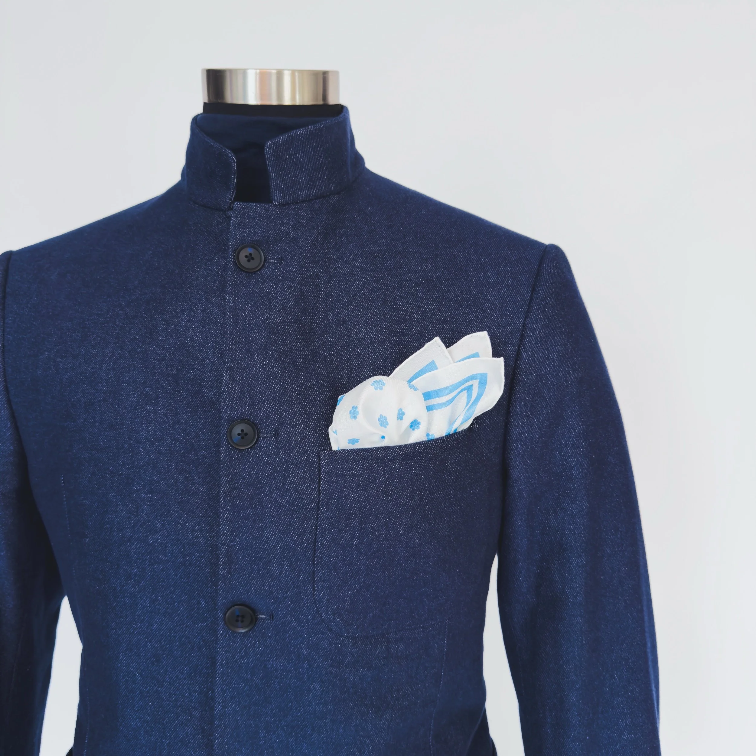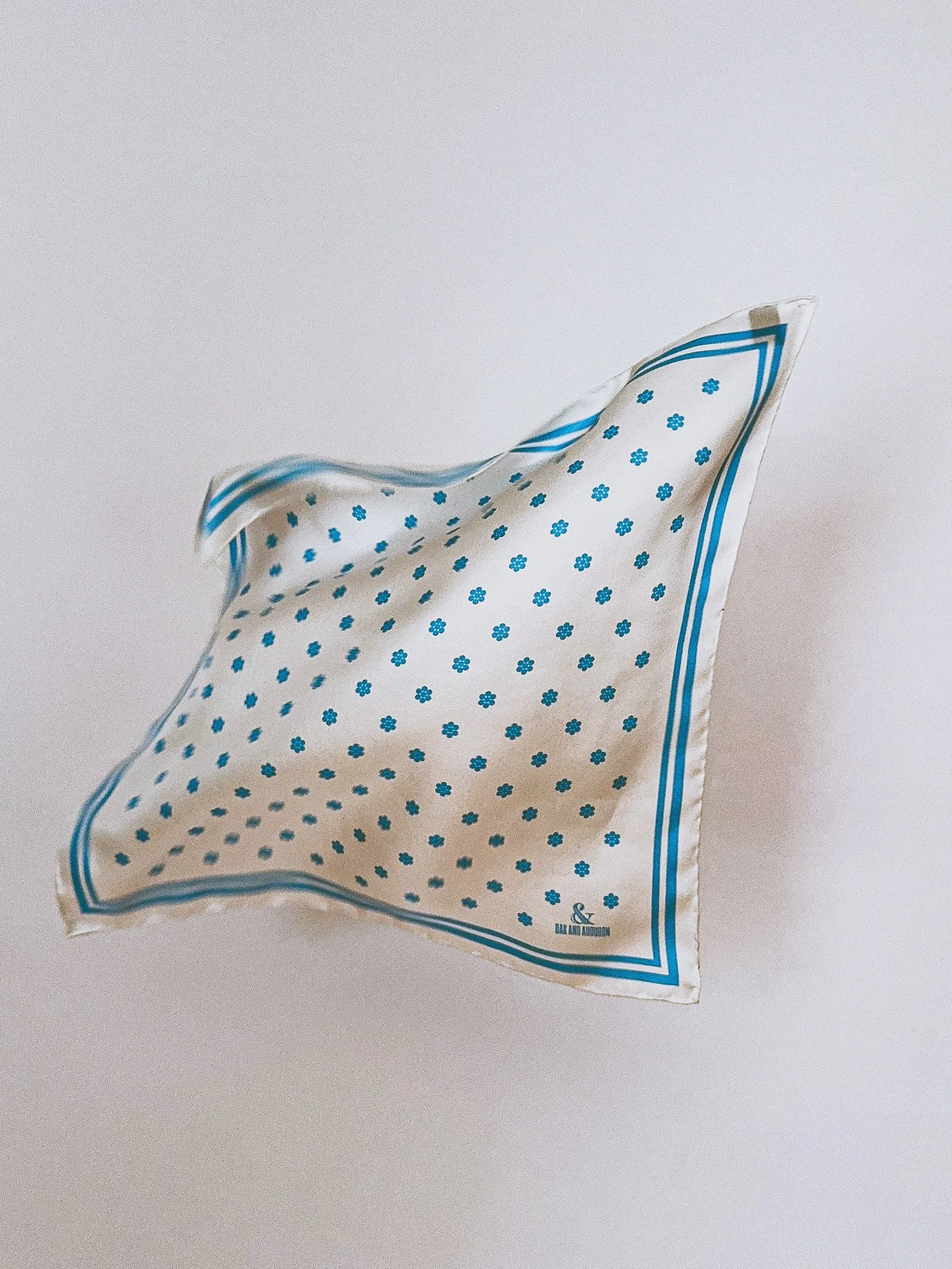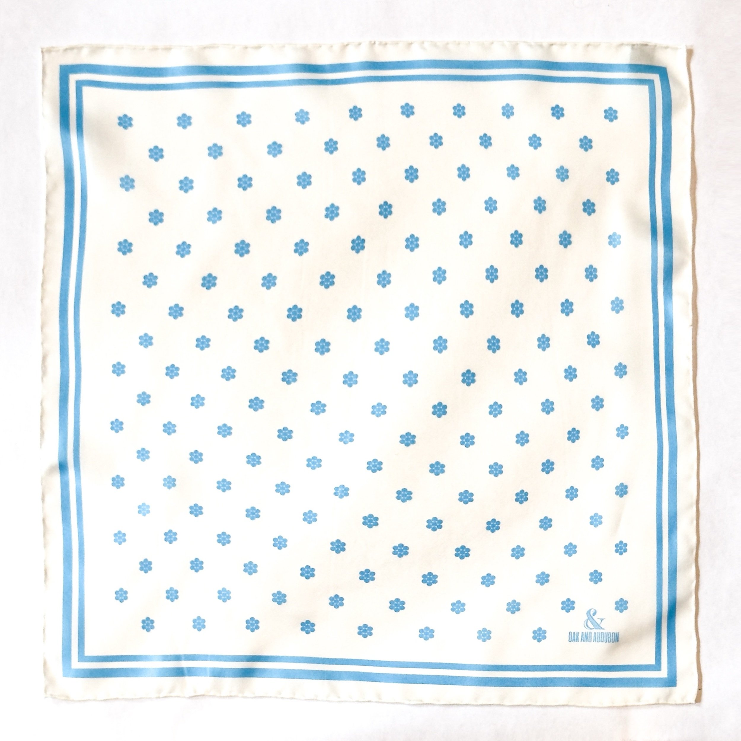 In featherweight 15 oz pure silk this handmade pocket square is a perfect addition to your wardrobe. In white with baby blue Cluster Dots.