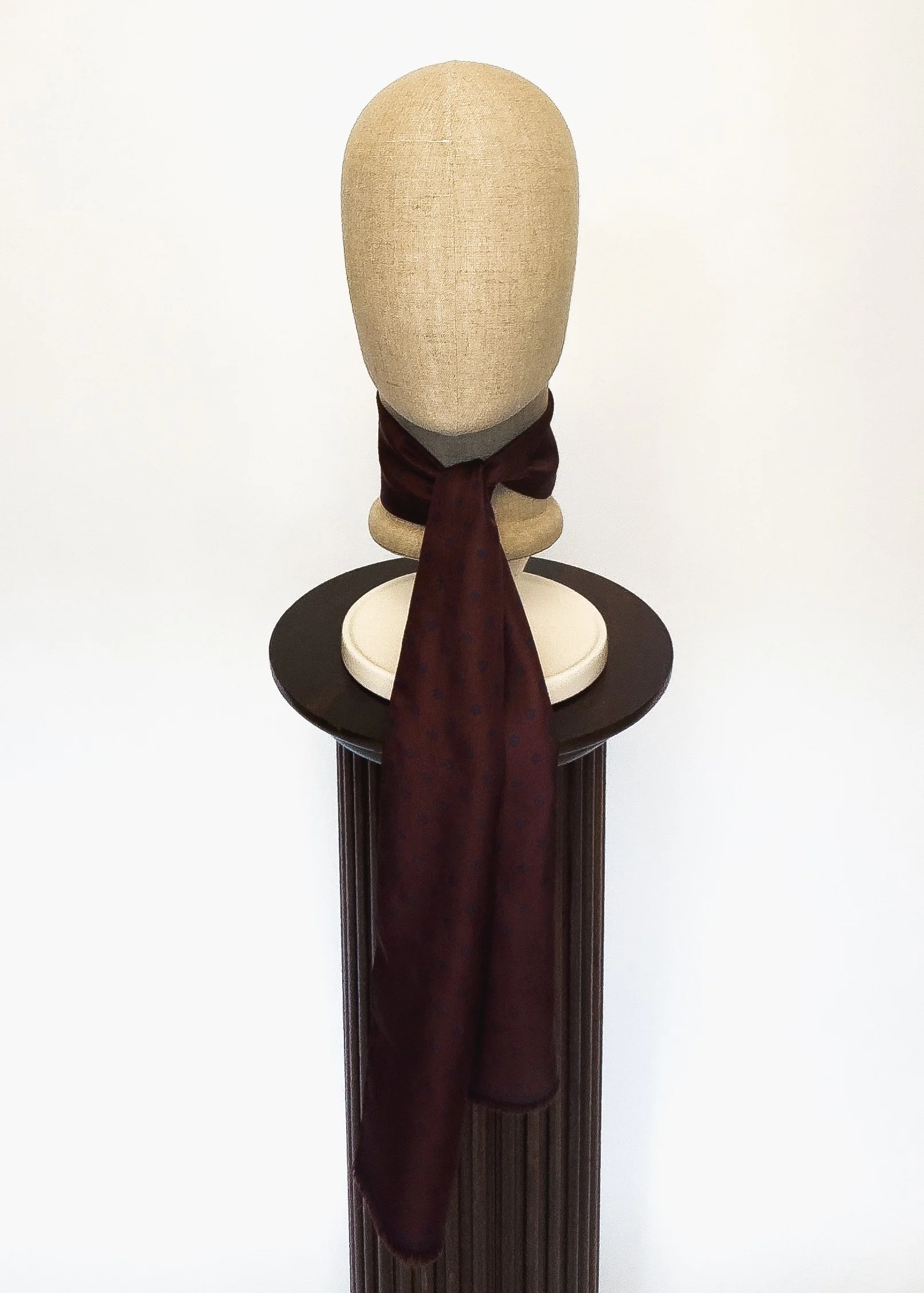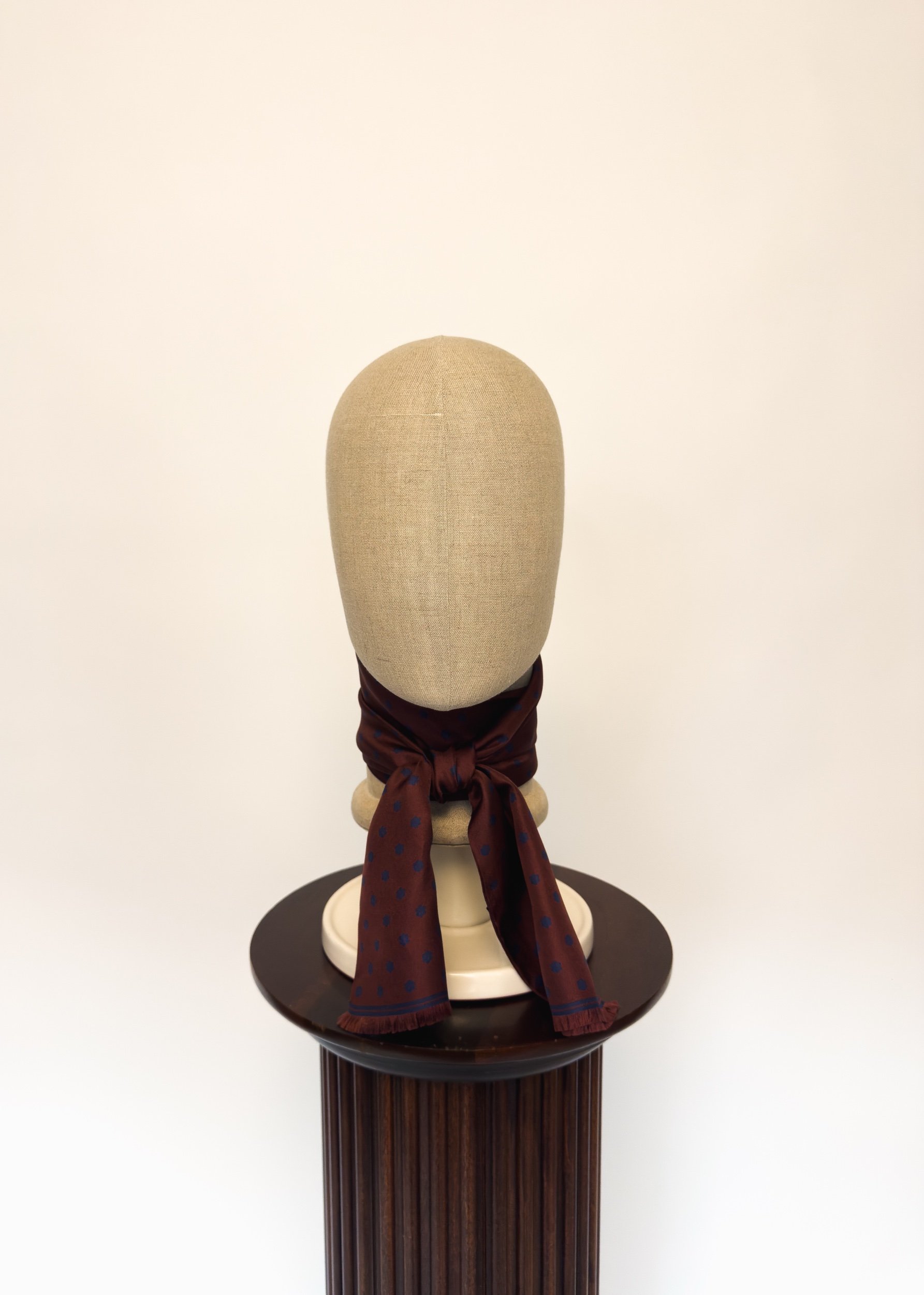 In featherweight 15 oz pure silk this handmade scarf is a unisex piece that can be enjoyed by anyone. In dark wine with navy blue Cluster Dot and border.