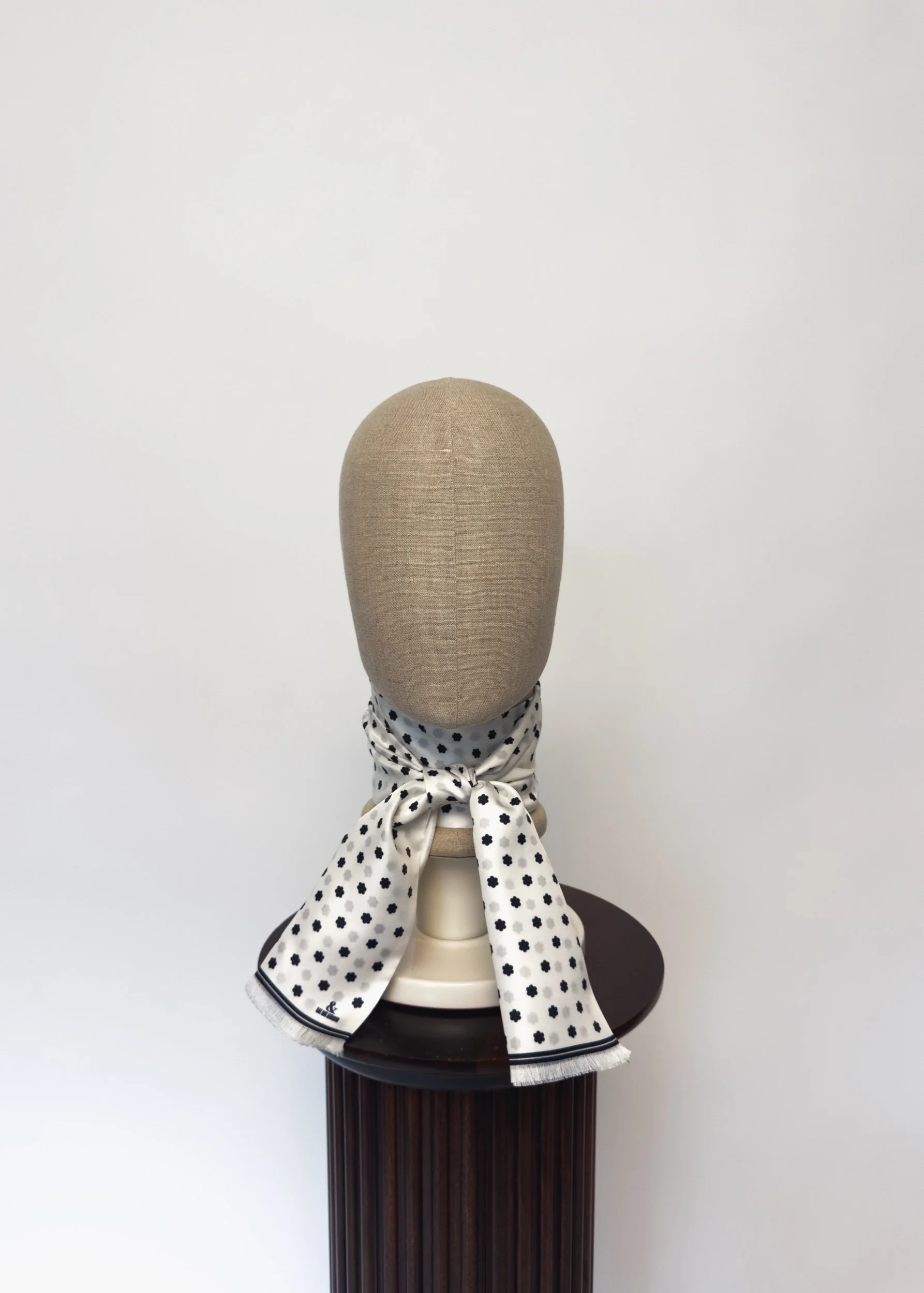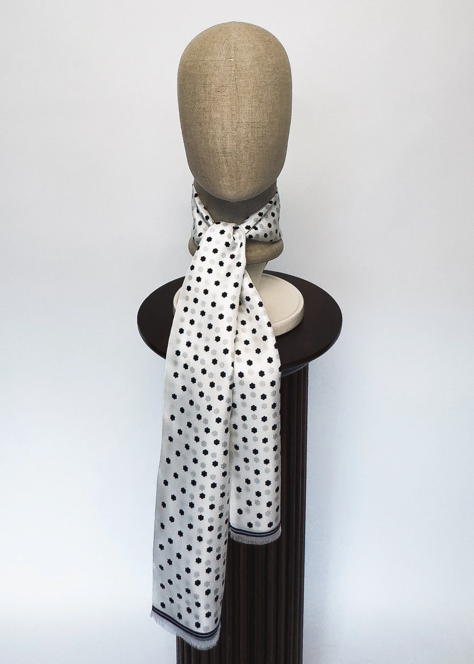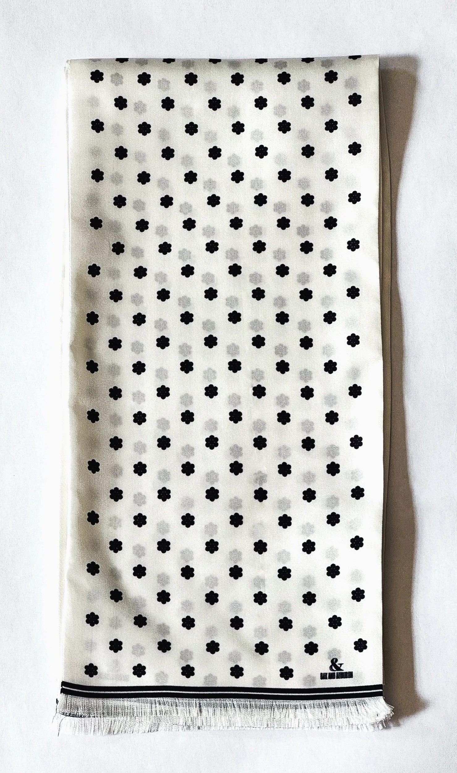 In featherweight 15 oz pure silk this handmade scarf is a unisex piece that can be enjoyed by anyone. In white with black Cluster Dot and border.