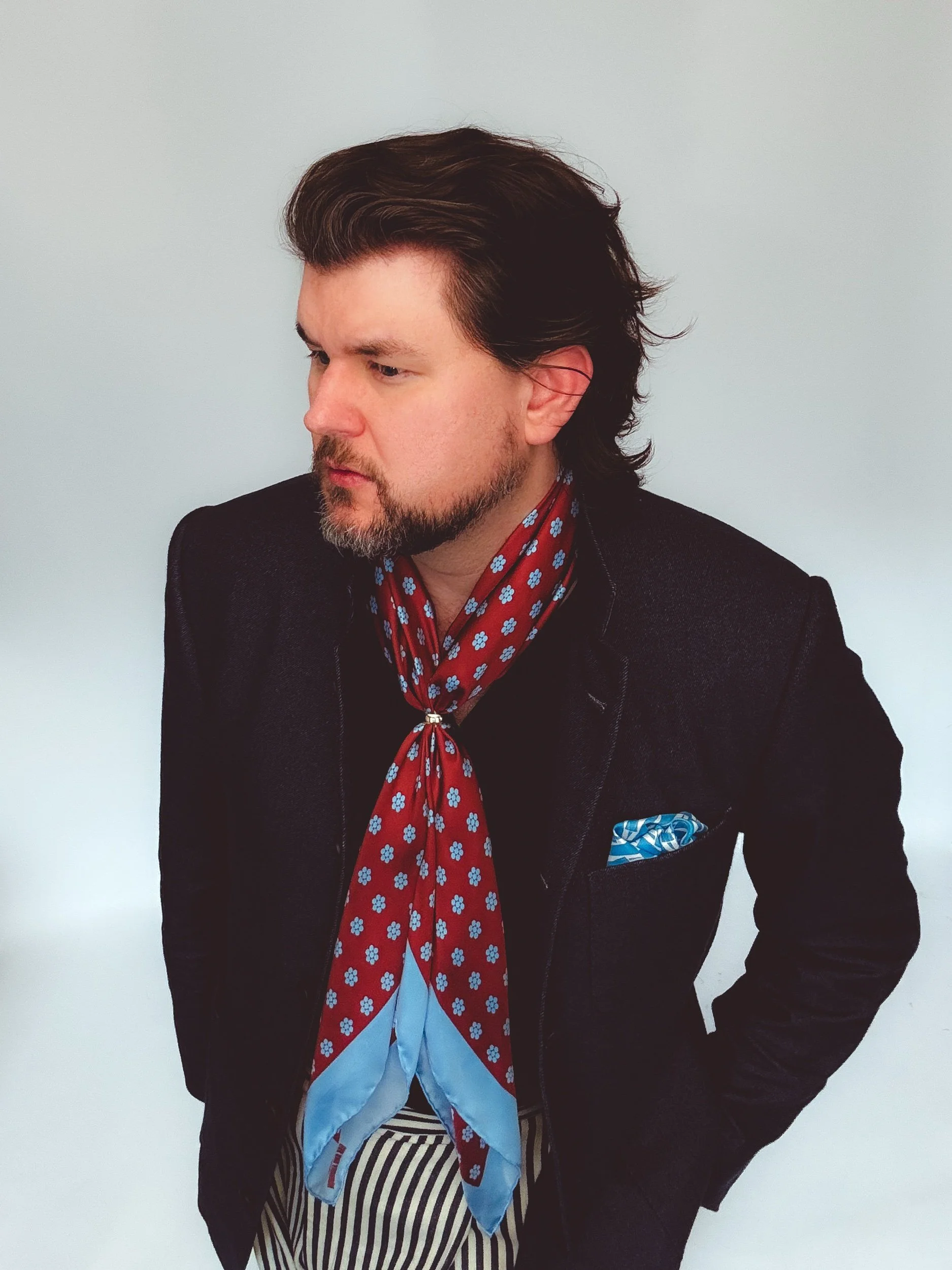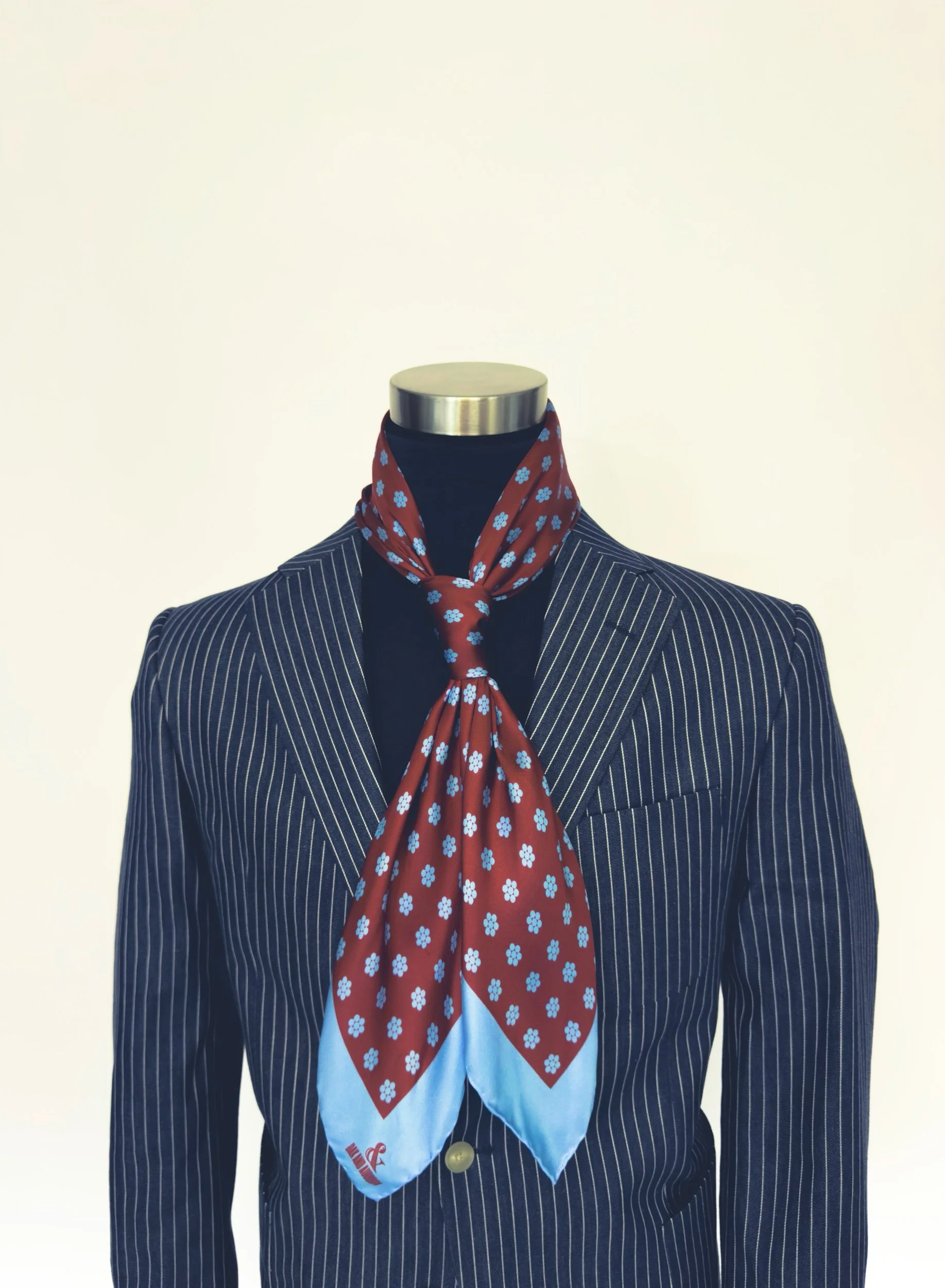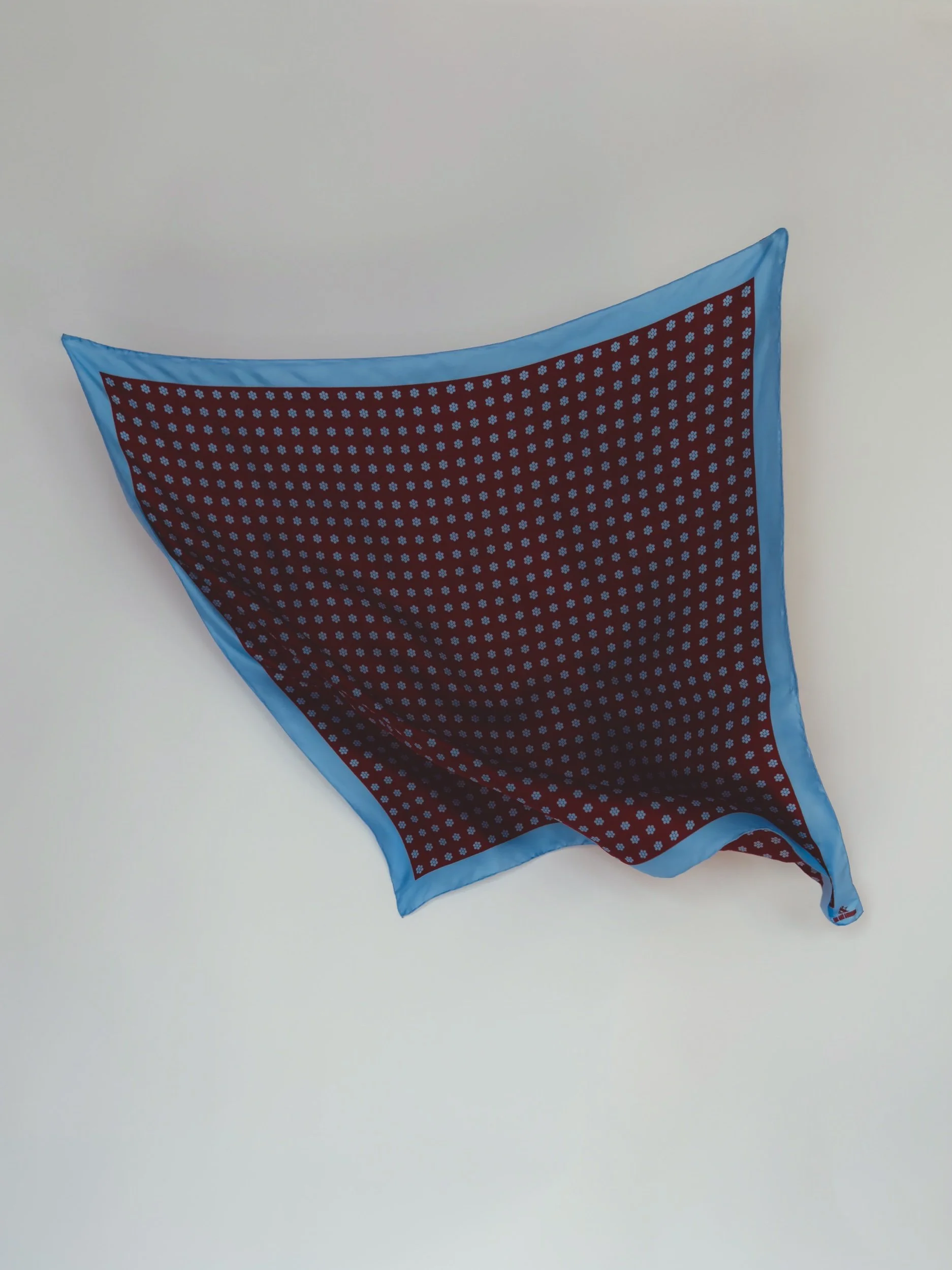 In featherweight 15 oz pure silk this handmade scarf is a unisex piece that can be enjoyed by anyone. In regent red base with baby blue Cluster Dot and border.