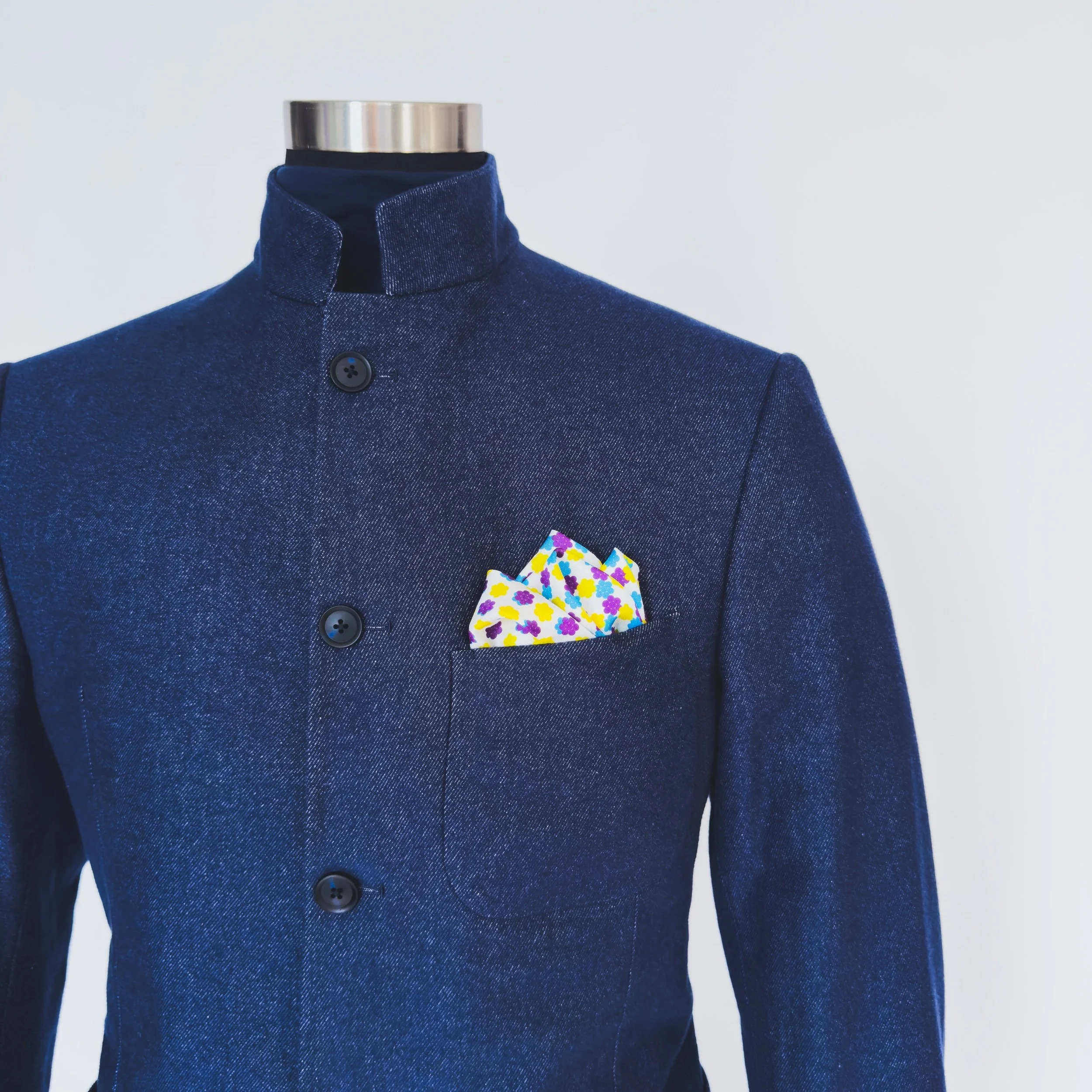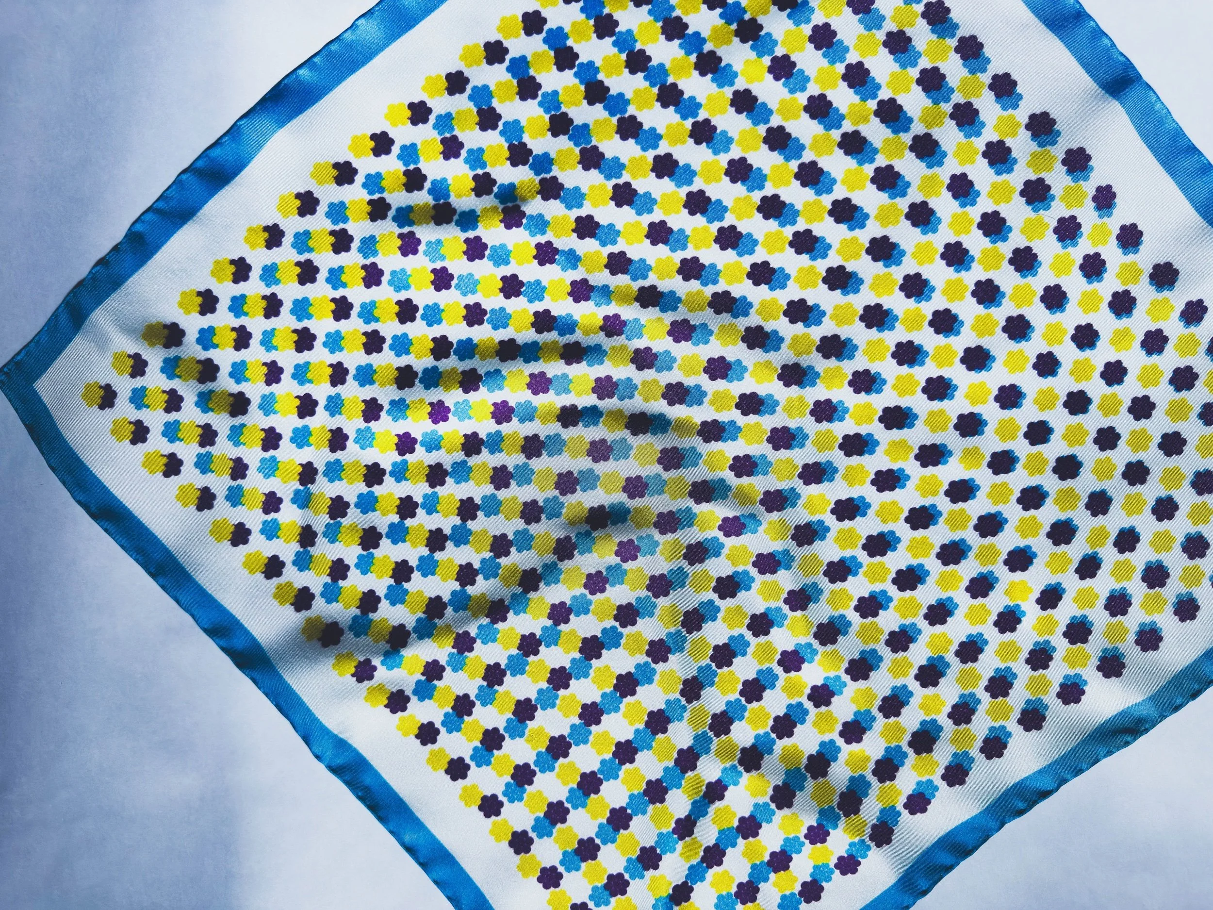 In featherweight 15 oz pure silk this handmade pocket square is a perfect addition to your wardrobe. In sunrise yellow, with turquoise blue and royal purple Cluster Dots.