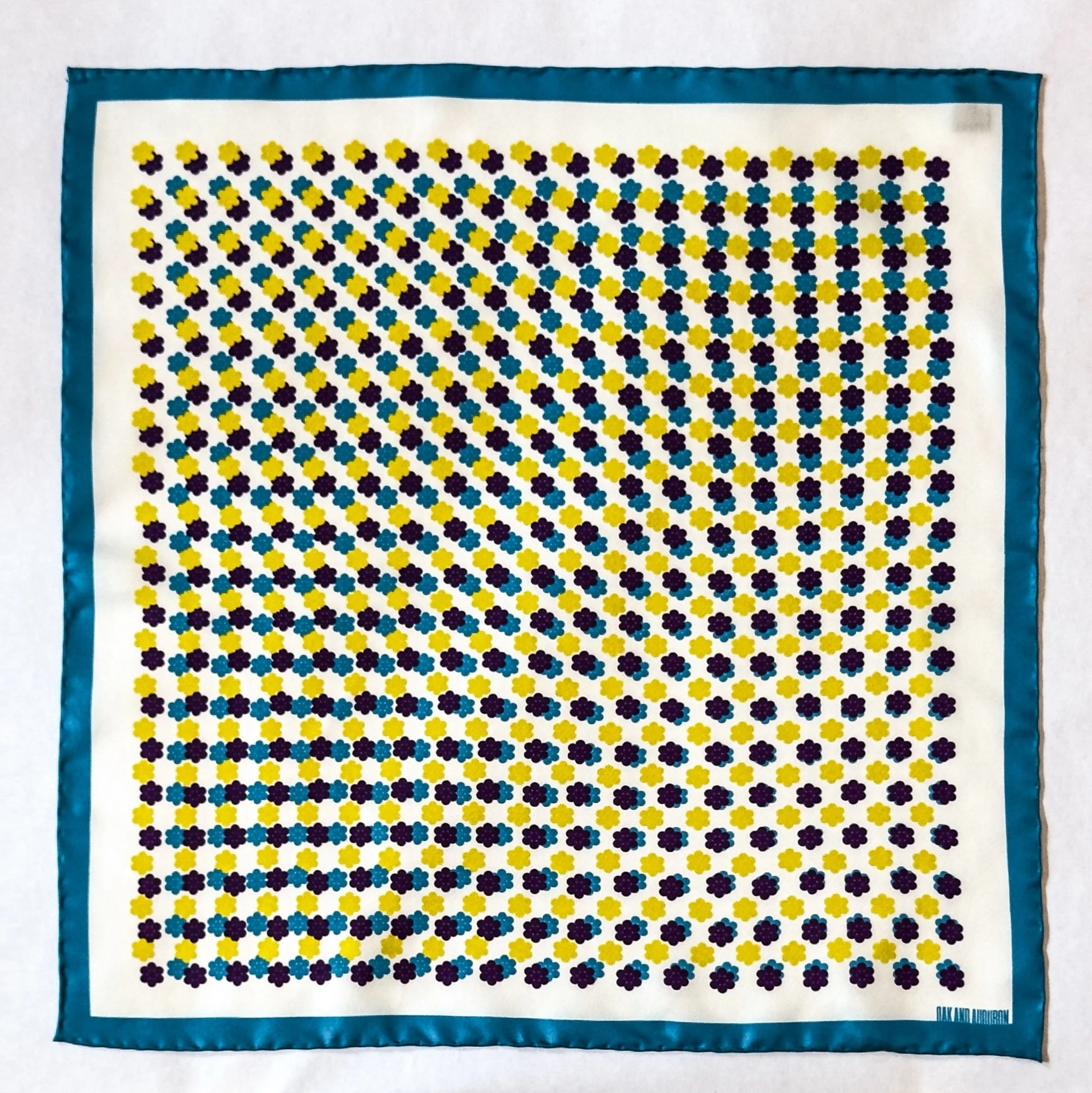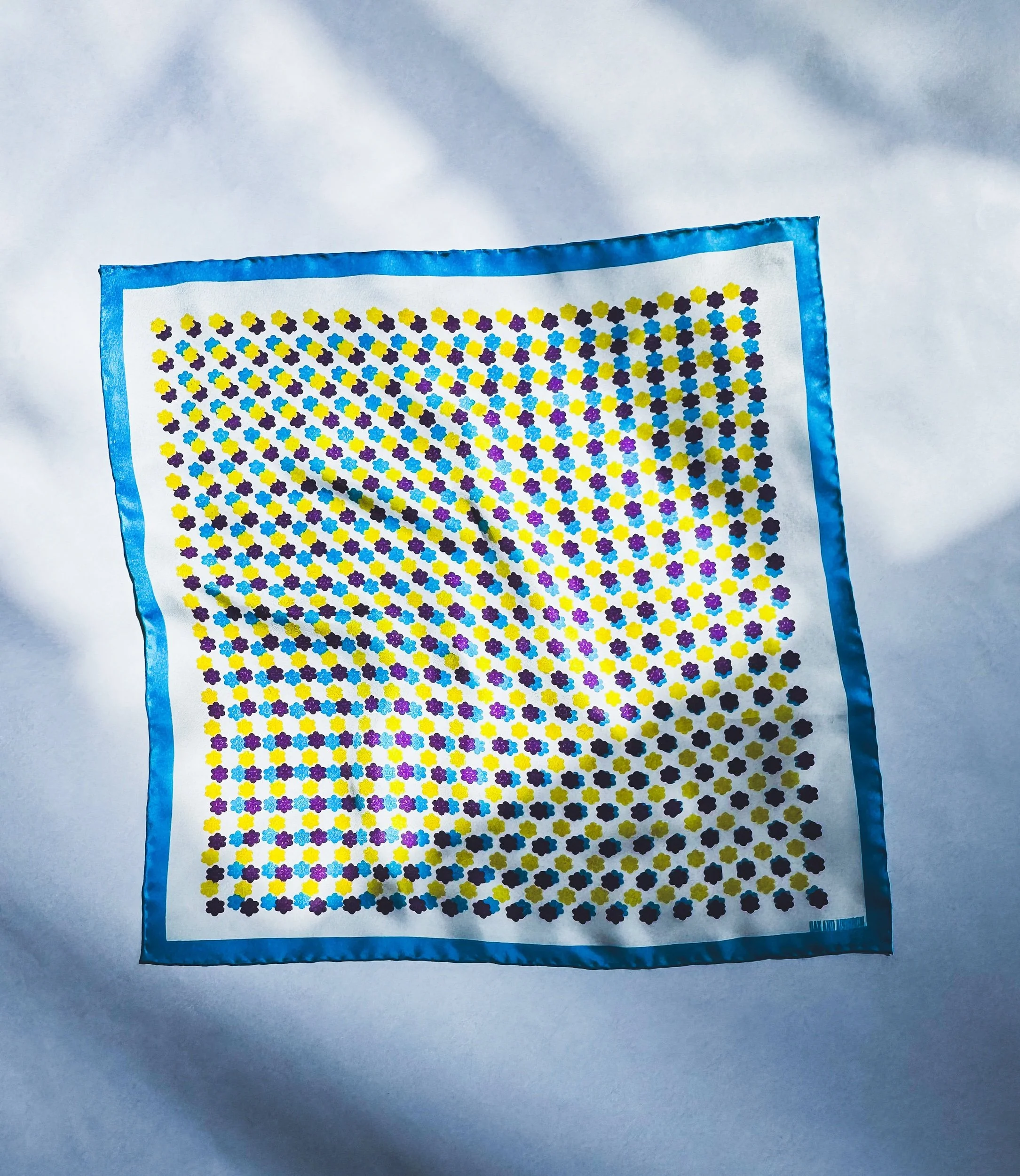 This pocket square uses our iconic Cluster Dot to explore pattern, tone, color, with a bit of whimsy.