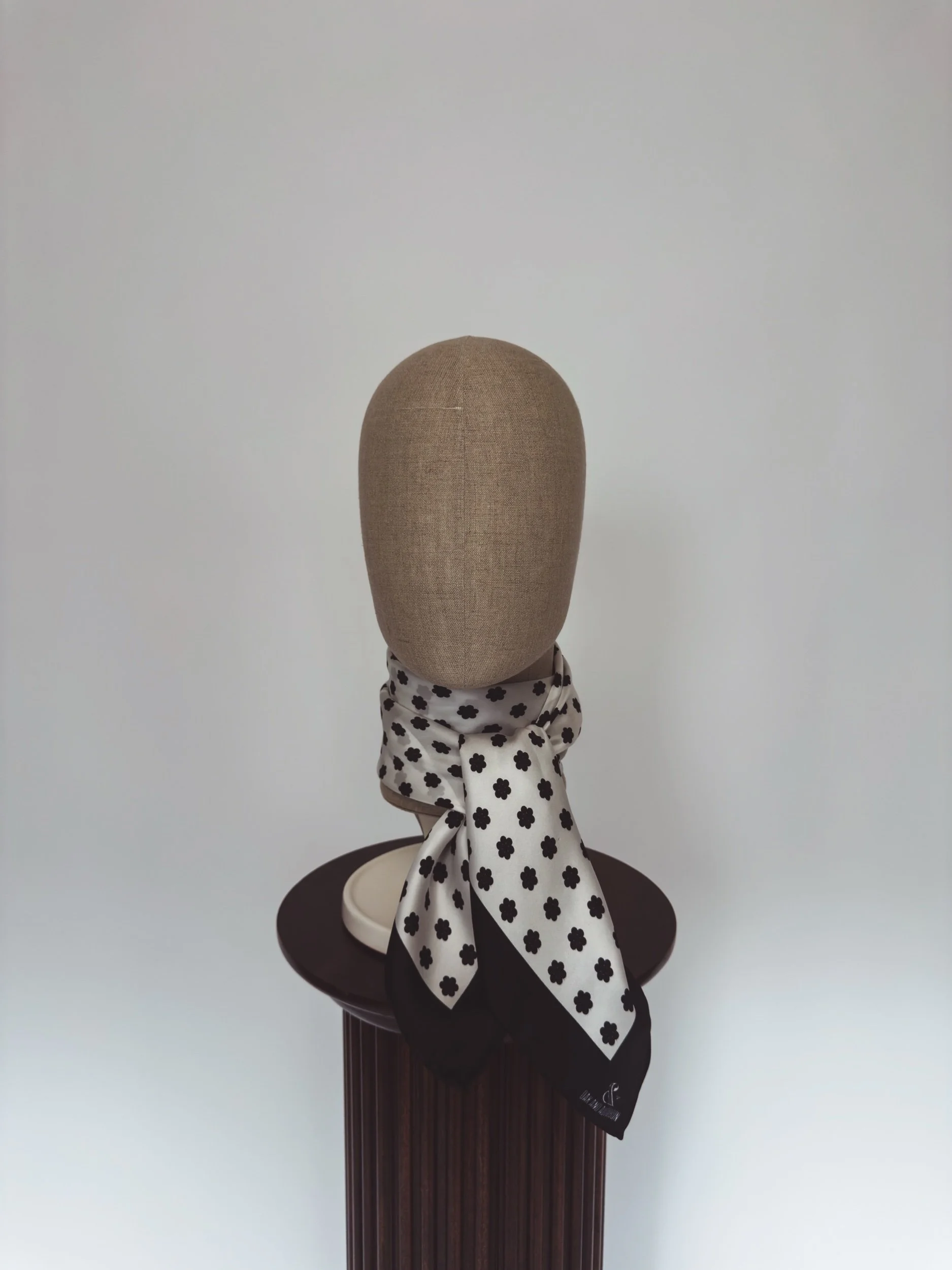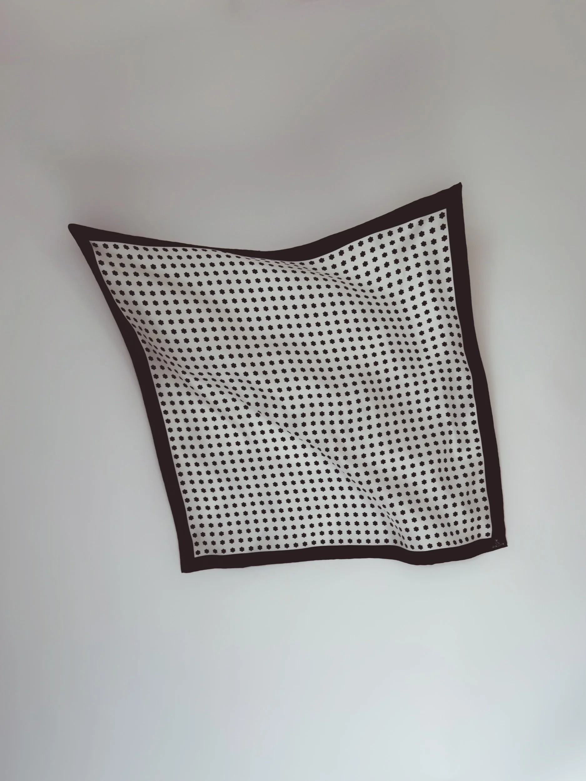 In featherweight 15 oz pure silk this handmade scarf is a unisex piece that can be enjoyed by anyone. In white with black Cluster Dot and border.