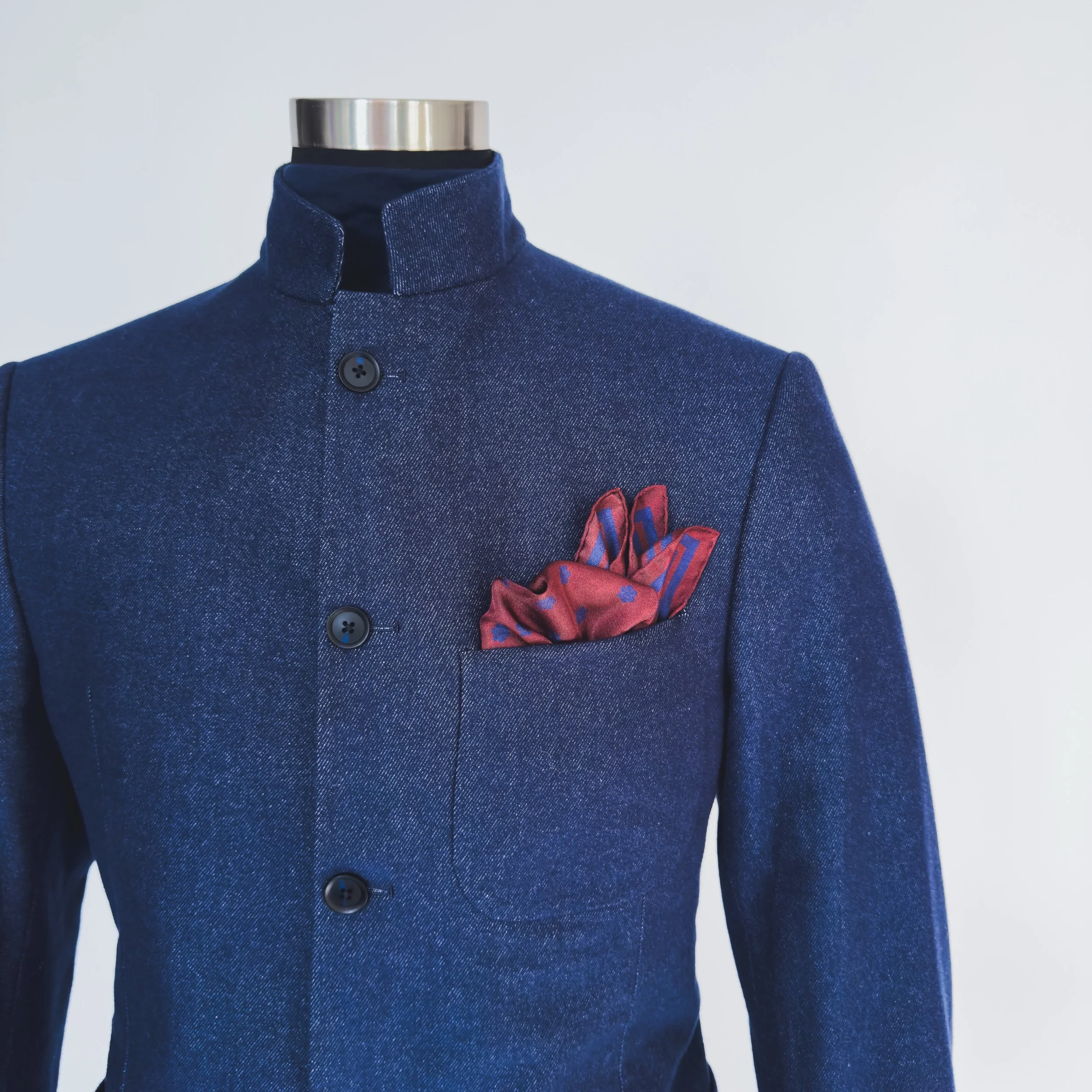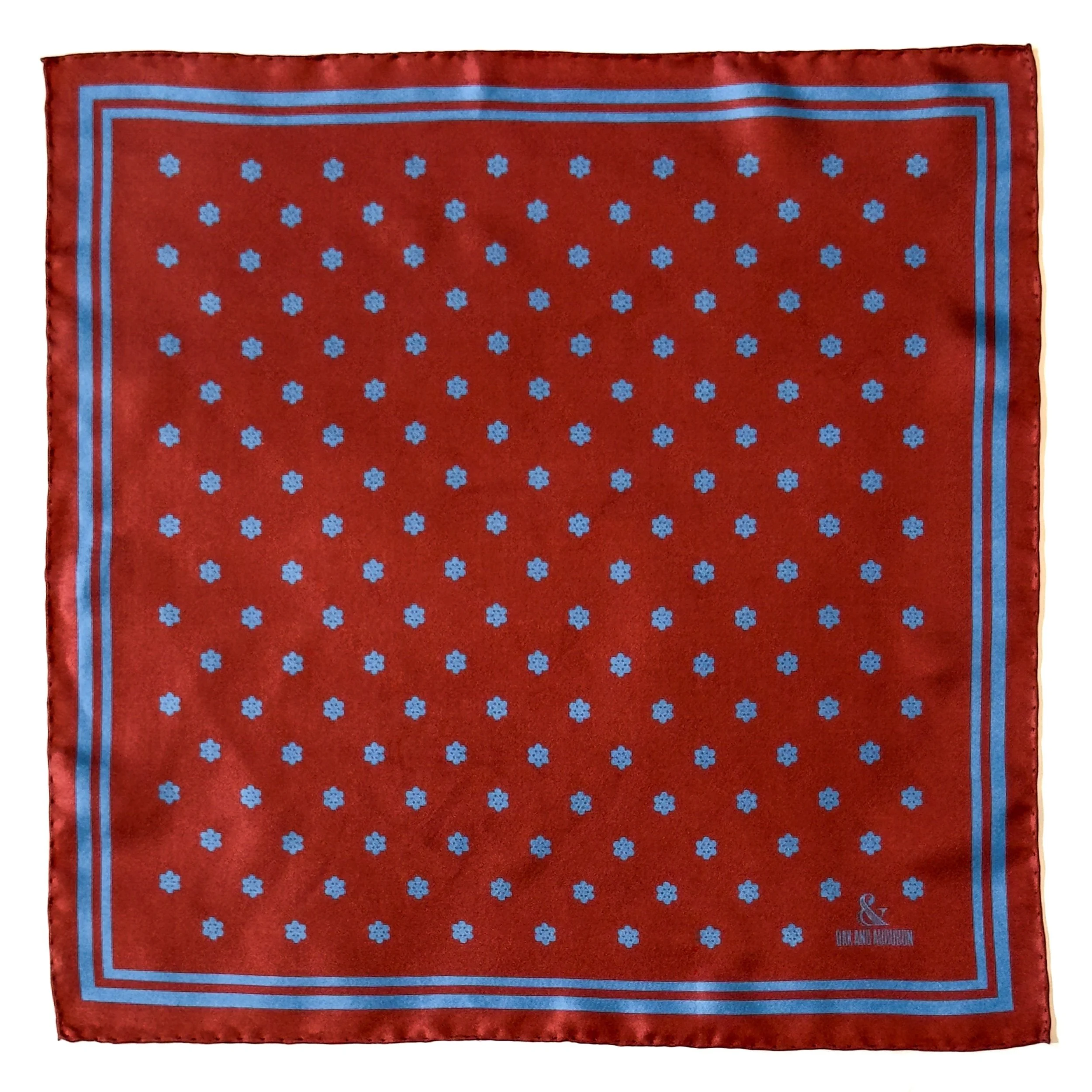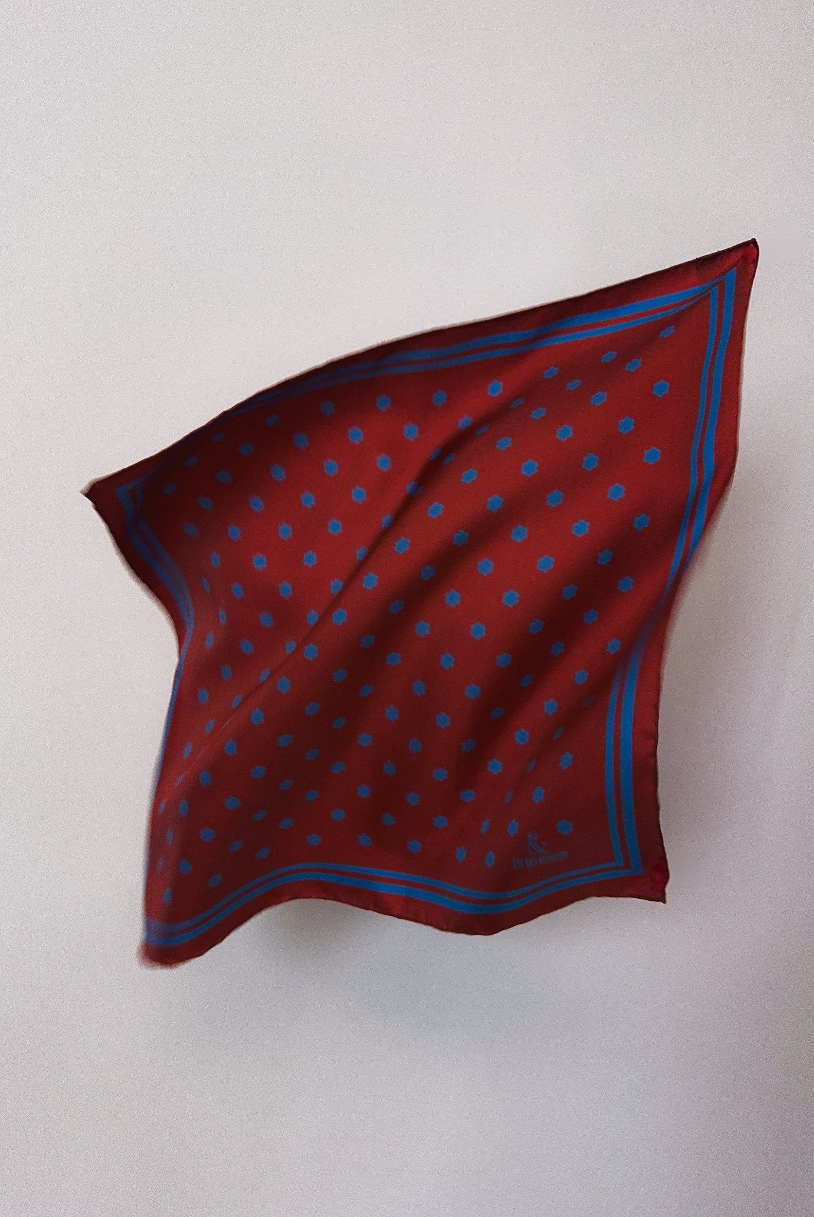 In featherweight 15 oz pure silk this handmade pocket square is a perfect addition to your wardrobe. In regency red with royal blue Cluster Dots.